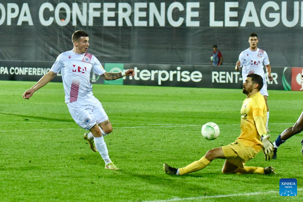 Zvonimir Kozulj (L) of Zrinjski shoots to score during the 2023-2024 UEFA Europa Conference League group E match between Zrinjski of Bosnia and Herzegovina and AZ Alkmaar of the Netherlands in Mostar, Bosnia and Herzegovina, Sept. 21, 2023. (Xinhua/Ermin)