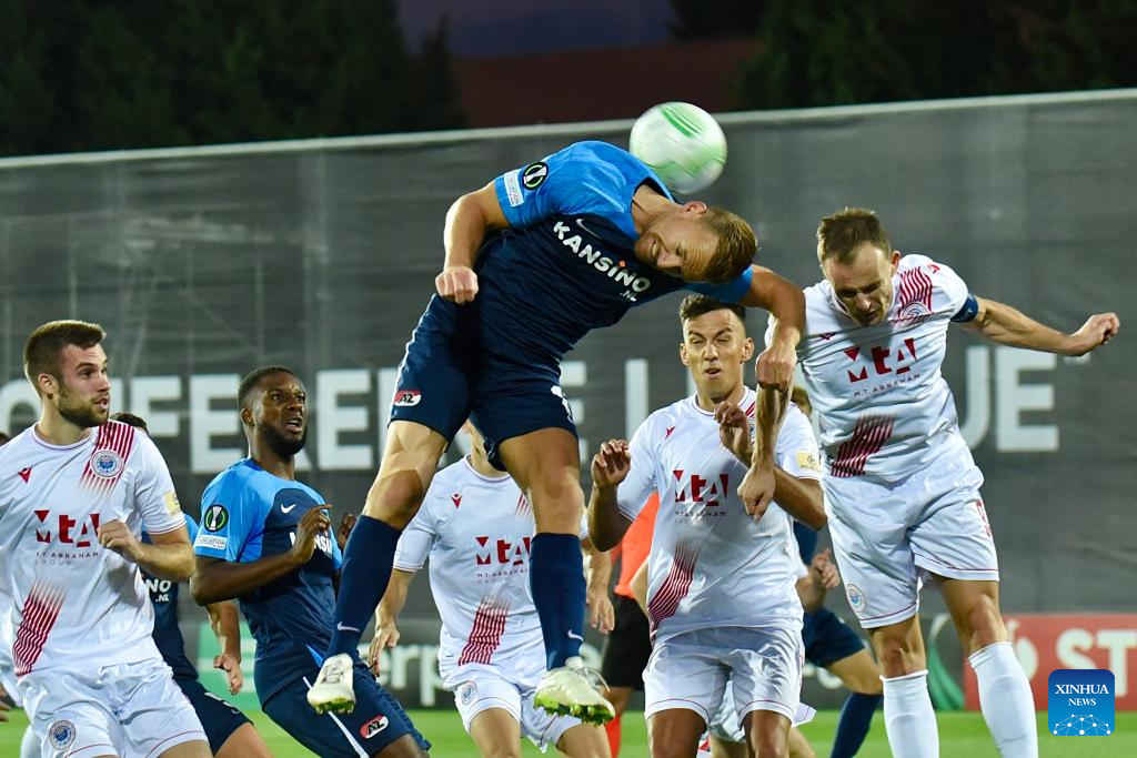 Dani de Wit (top L) of AZ Alkmaar vies for a header during the 2023-2024 UEFA Europa Conference League group E match between Zrinjski of Bosnia and Herzegovina and AZ Alkmaar of the Netherlands in Mostar, Bosnia and Herzegovina, Sept. 21, 2023. (Xinhua/Ermin)