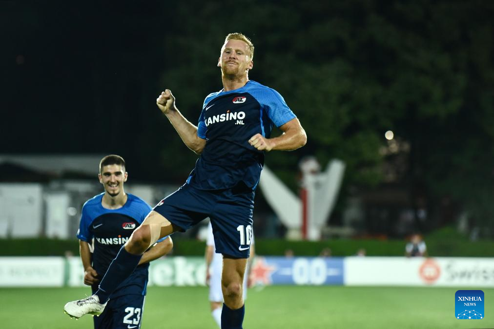 Dani de Wit (R) of AZ Alkmaar celebrates his goal during the 2023-2024 UEFA Europa Conference League group E match between Zrinjski of Bosnia and Herzegovina and AZ Alkmaar of the Netherlands in Mostar, Bosnia and Herzegovina, Sept. 21, 2023. (Xinhua/Ermin)