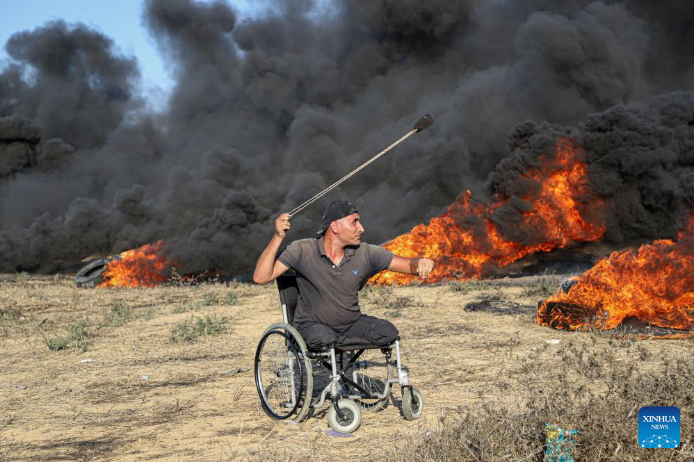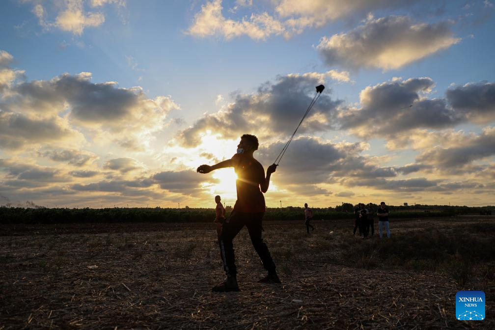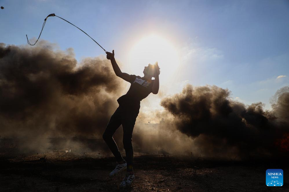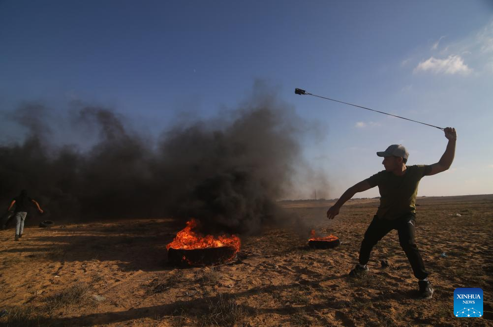 A Palestinian protester uses a slingshot to hurl a stone at Israeli soldiers during clashes near the fence of the Gaza-Israel border east of Gaza City, on Sept. 22, 2023. Earlier on Friday, clashes between Palestinian protesters and the Israeli army erupted along the eastern border that separates Gaza from Israeli cities, Palestinian sources said. At least 28 Palestinians were wounded by Israeli forces during the clashes, the Hamas-run Health Ministry said in a statement. (Photo by Rizek Abdeljawad/Xinhua)