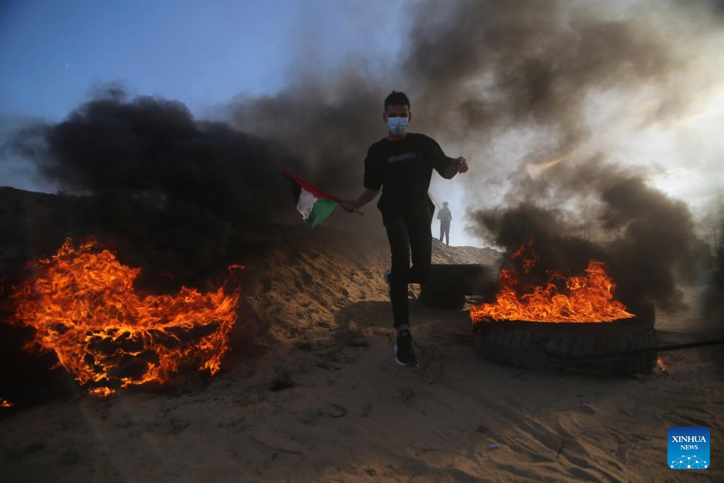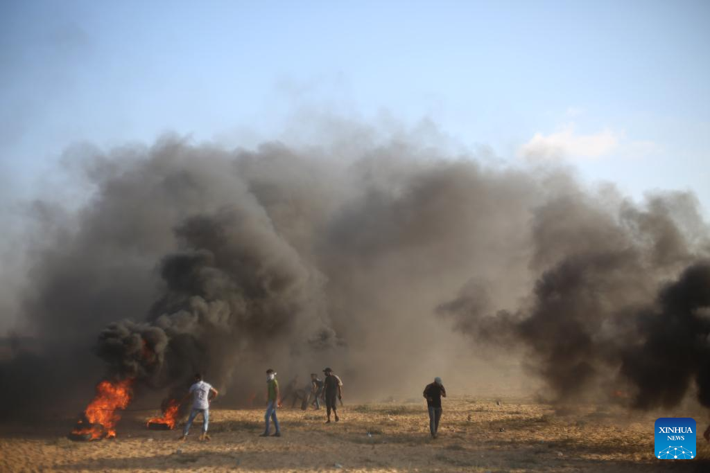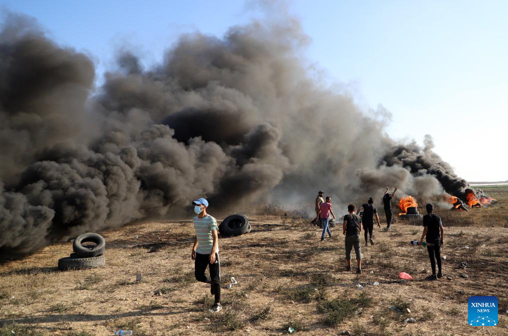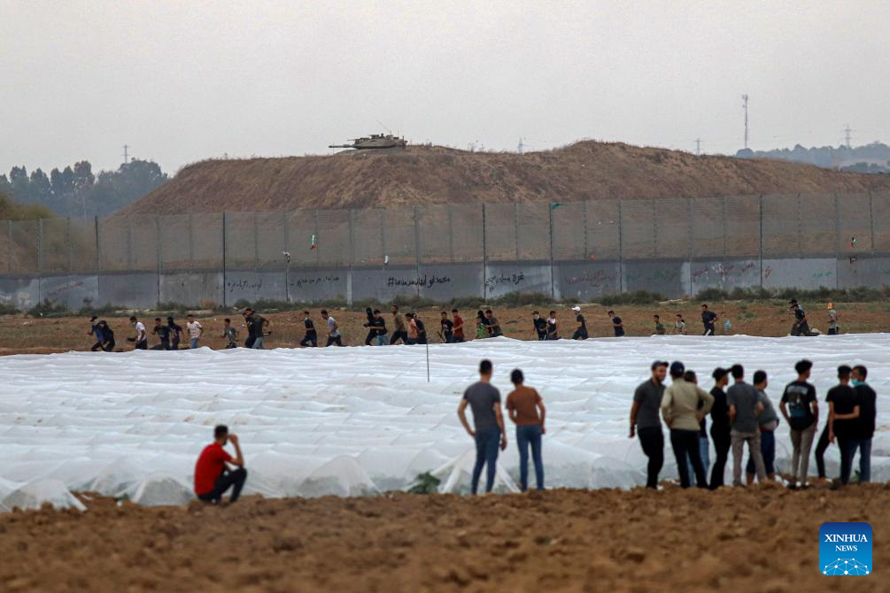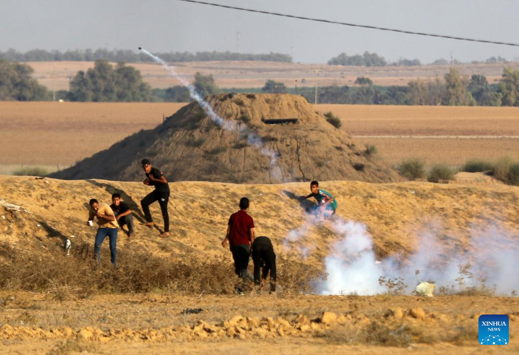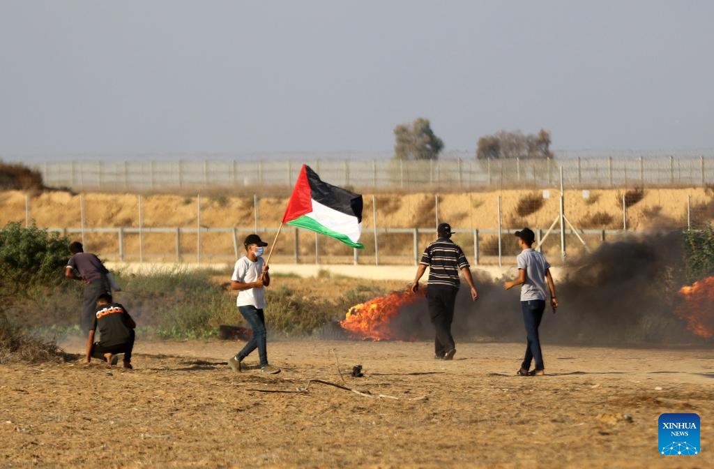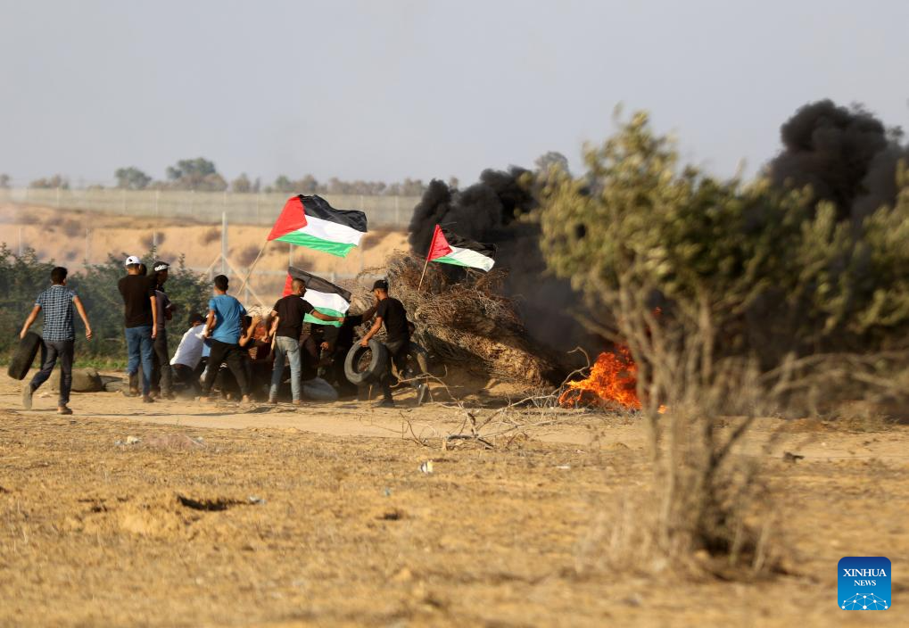 Palestinian protesters are seen during clashes with Israeli soldiers near the fence of the Gaza-Israel border east of Gaza City, on Sept. 22, 2023. Earlier on Friday, clashes between Palestinian protesters and the Israeli army erupted along the eastern border that separates Gaza from Israeli cities, Palestinian sources said. At least 28 Palestinians were wounded by Israeli forces during the clashes, the Hamas-run Health Ministry said in a statement. (Photo by Rizek Abdeljawad/Xinhua)