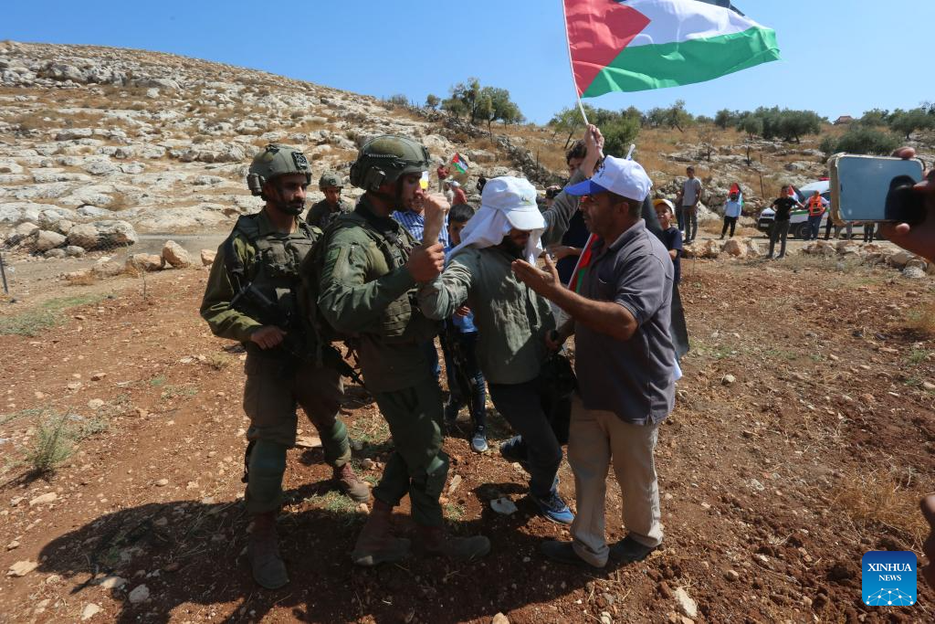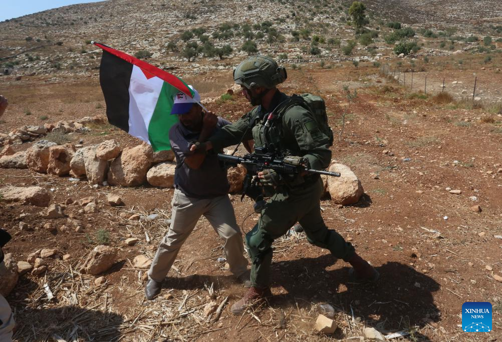 A Palestinian protester clashes with an Israeli soldier following a protest against the expansion of Jewish settlements in the West Bank village of Beit Dajan, east of Nablus, on Sept. 22, 2023. (Photo by Nidal Eshtayeh/Xinhua)
