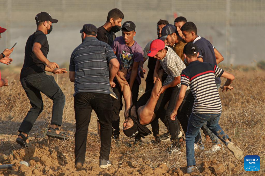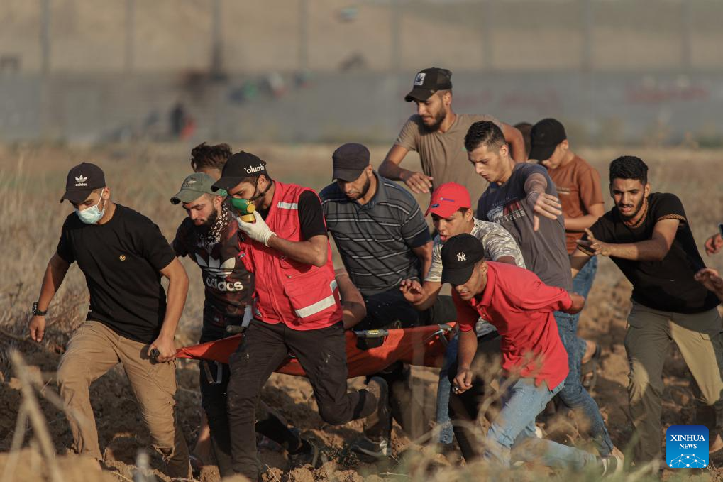Palestinians carry a wounded man during clashes with Israeli soldiers near the fence of the Gaza-Israel border east of Gaza City, on Sept. 22, 2023. Earlier on Friday, clashes between Palestinian protesters and the Israeli army erupted along the eastern border that separates Gaza from Israeli cities, Palestinian sources said. At least 28 Palestinians were wounded by Israeli forces during the clashes, the Hamas-run Health Ministry said in a statement. (Photo by Rizek Abdeljawad/Xinhua)