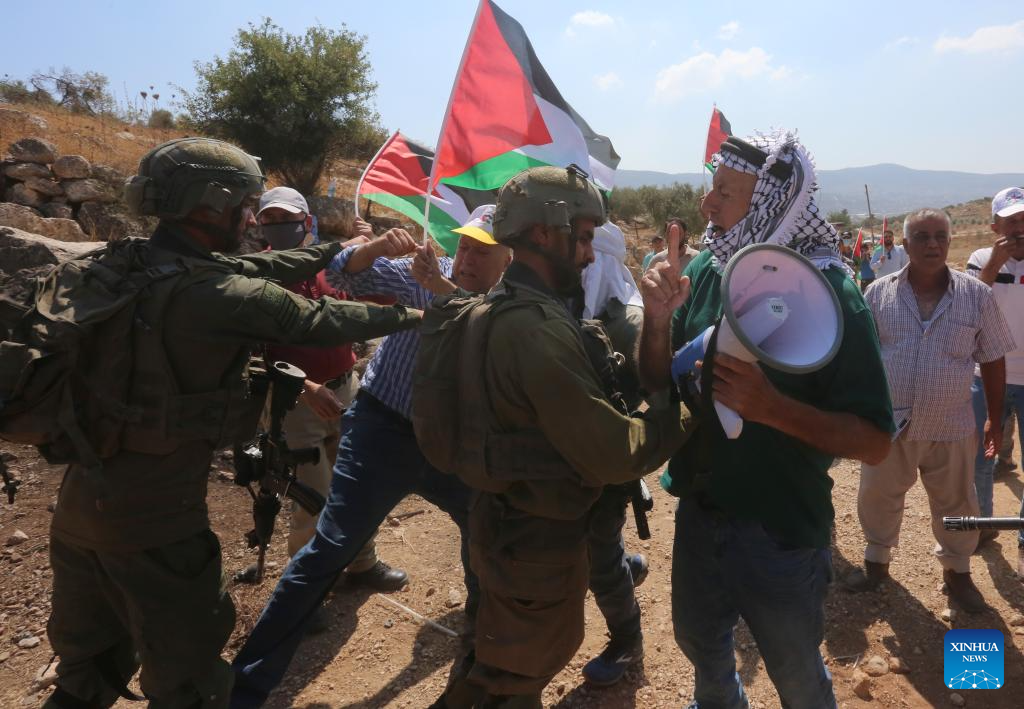 Palestinian protesters clash with Israeli soldiers following a protest against the expansion of Jewish settlements in the West Bank village of Beit Dajan, east of Nablus, on Sept. 22, 2023. (Photo by Nidal Eshtayeh/Xinhua)