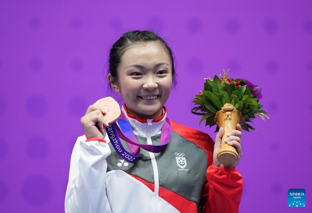Bronze medalist Ong Li Ling Kimberly of Singapore poses for photos during the awarding ceremony for the Women's Changquan of Wushu at the 19th Asian Games in Hangzhou, east China's Zhejiang Province, Sept. 25, 2023. (Xinhua/Li Yibo)