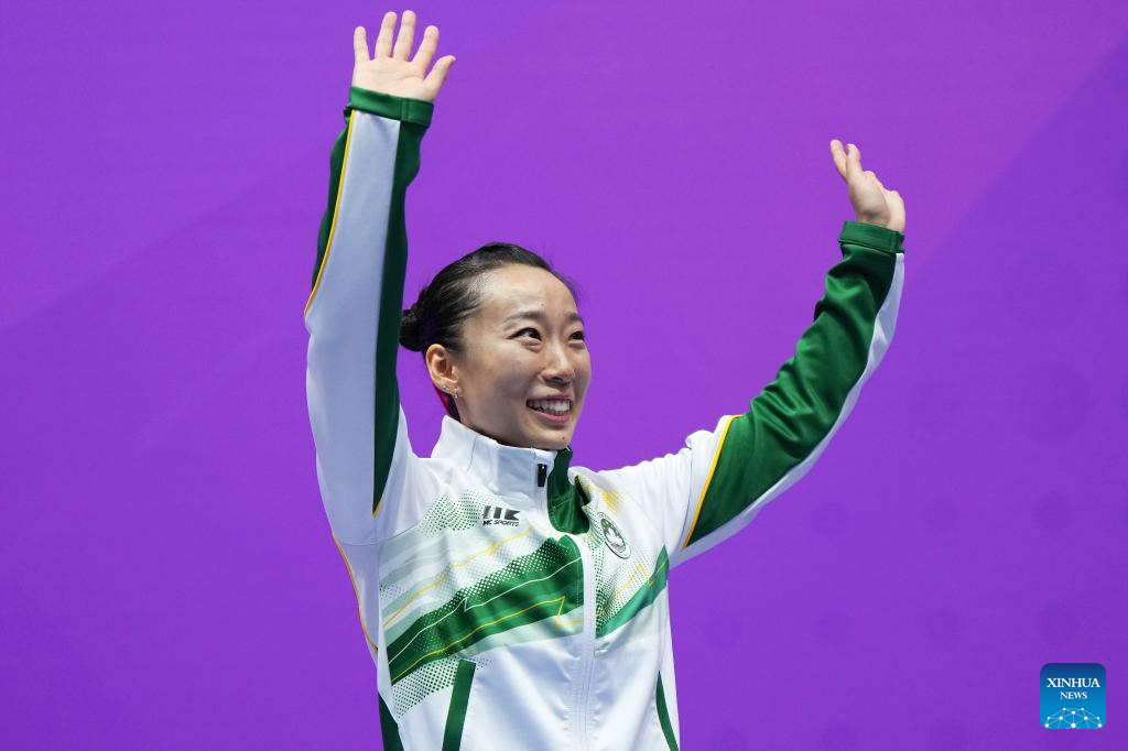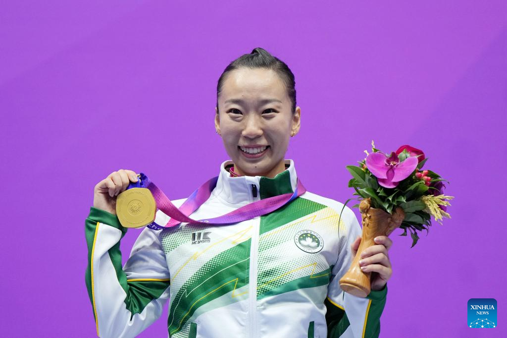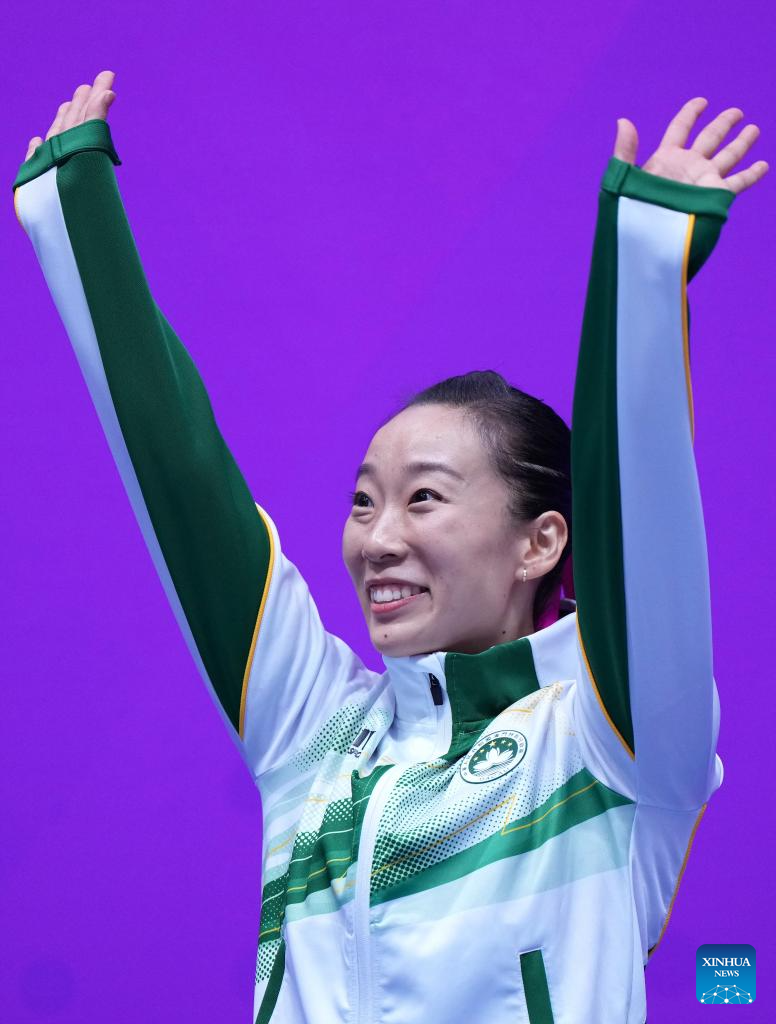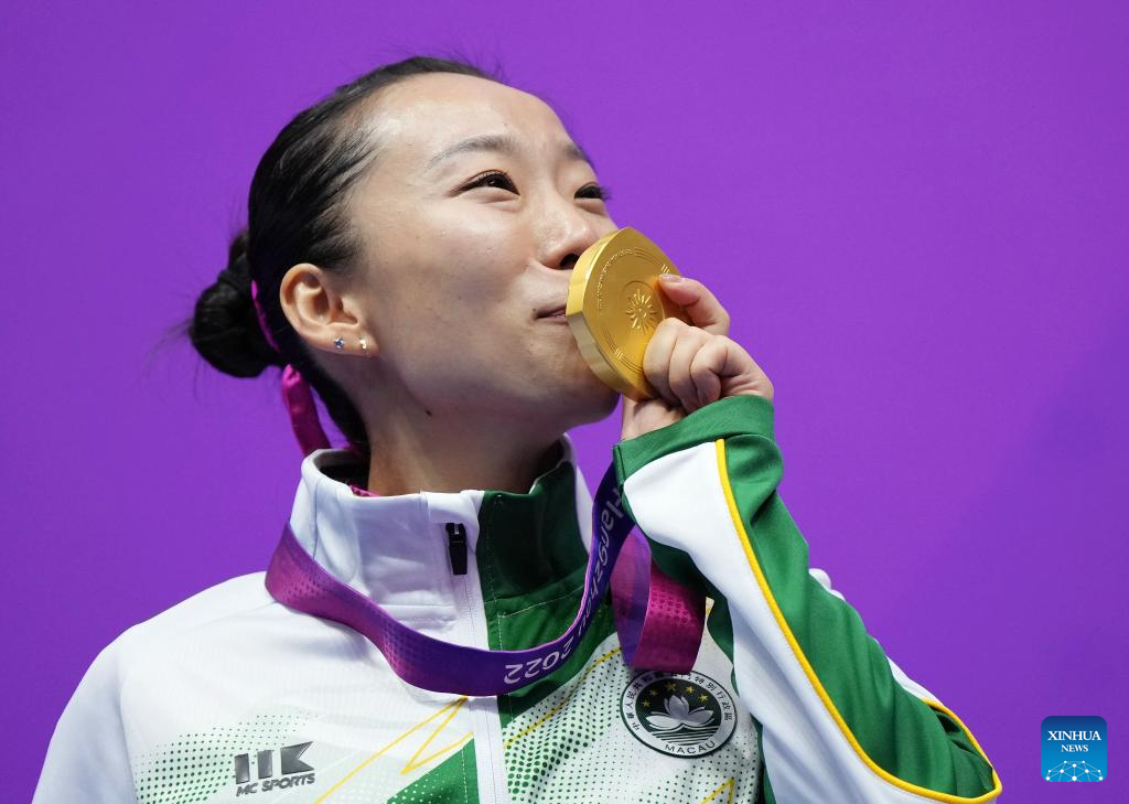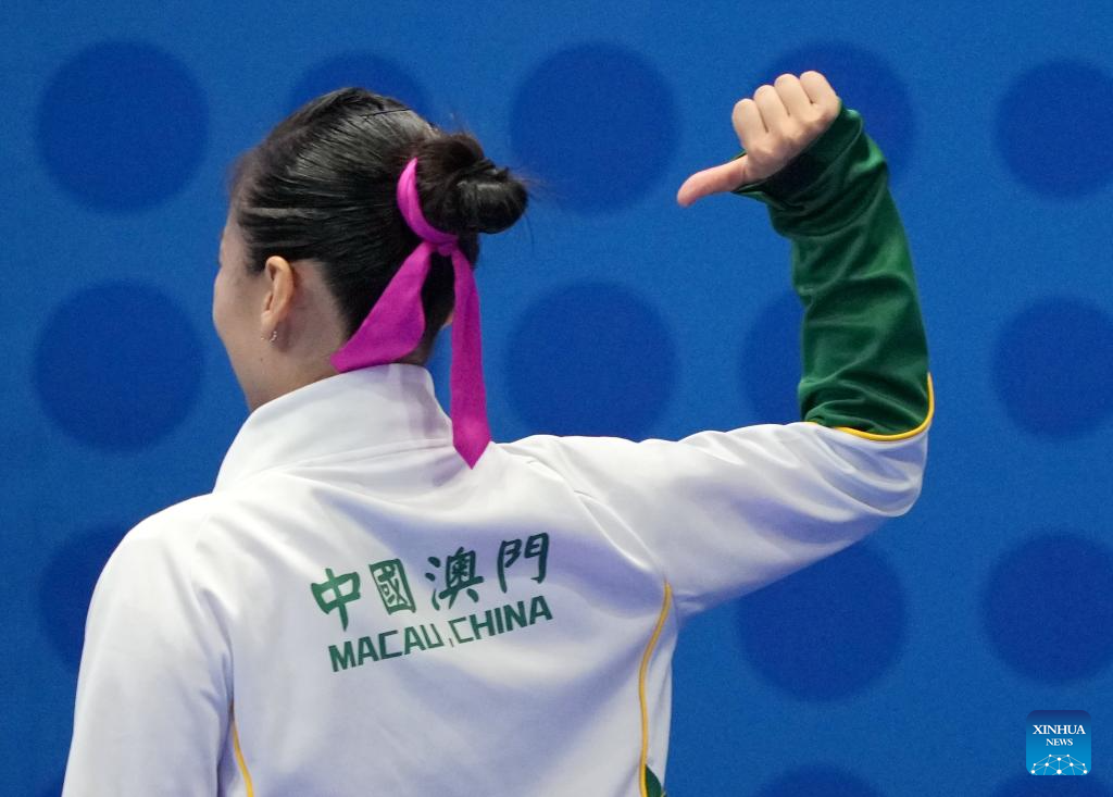 Gold medalist Li Yi of China's Macao celebrates during the awarding ceremony for the Women's Changquan of Wushu at the 19th Asian Games in Hangzhou, east China's Zhejiang Province, Sept. 25, 2023. (Xinhua/Li Yibo)