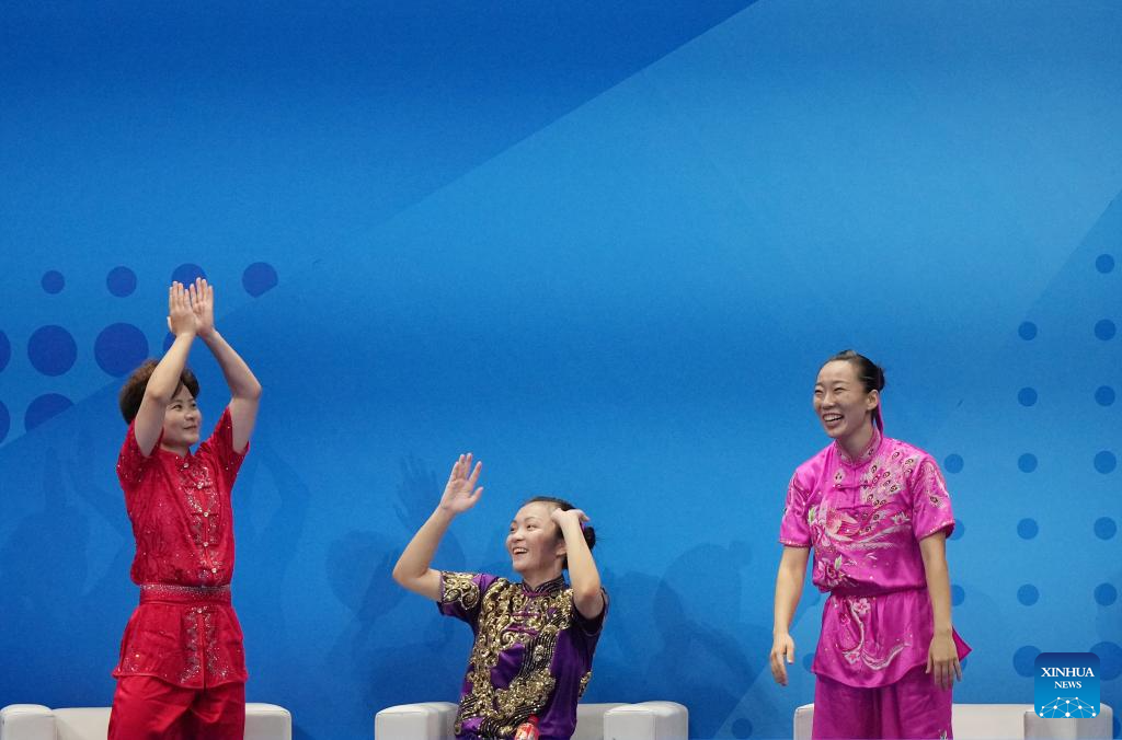 Li Yi (R) of China's Macao, Liu Xuxu (L) of China's Hong Kong and Ong Li Ling Kimberly of Singapore celebrate after the Women's Changquan Final of Wushu at the 19th Asian Games in Hangzhou, east China's Zhejiang Province, Sept. 25, 2023. (Xinhua/Li Yibo)