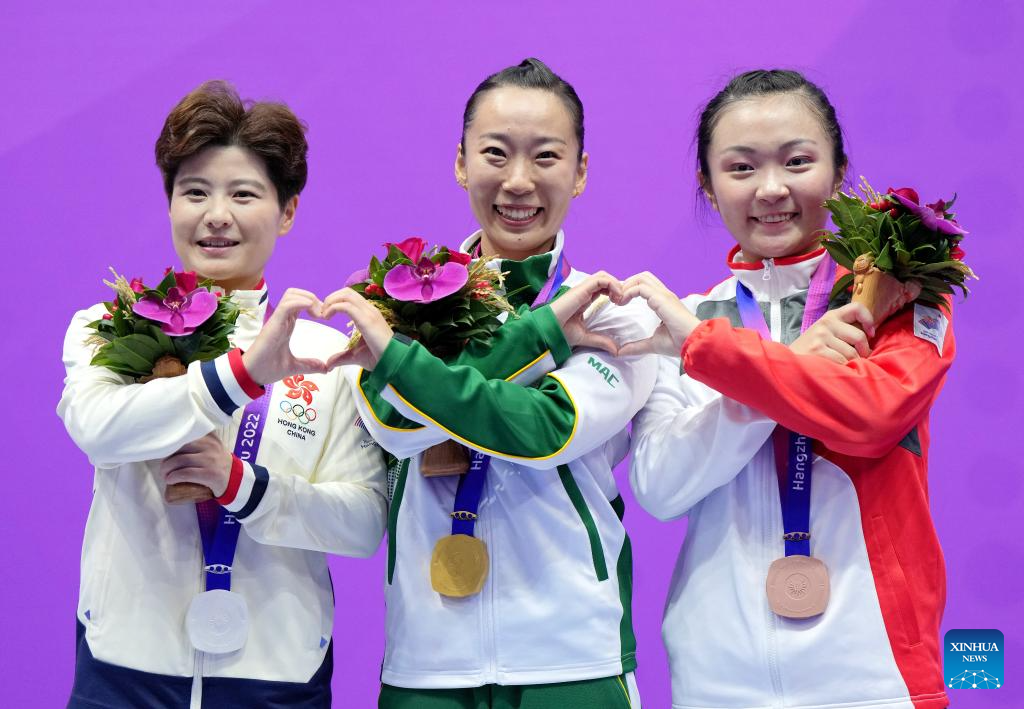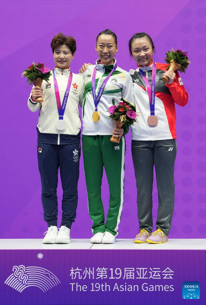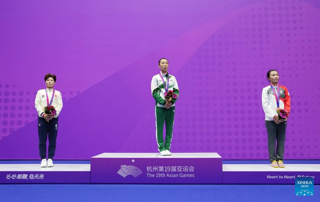 Gold medalist Li Yi (C) of China's Macao, silver medalist Liu Xuxu (L) of China's Hong Kong and bronze medalist Ong Li Ling Kimberly of Singapore pose for photos during the awarding ceremony for the Women's Changquan of Wushu at the 19th Asian Games in Hangzhou, east China's Zhejiang Province, Sept. 25, 2023. (Xinhua/Li Yibo)