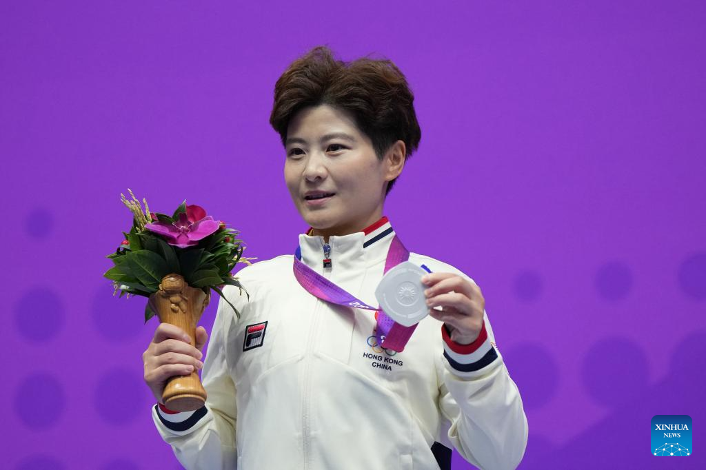 Silver medalist Liu Xuxu of China's Hong Kong poses for photos during the awarding ceremony for the Women's Changquan of Wushu at the 19th Asian Games in Hangzhou, east China's Zhejiang Province, Sept. 25, 2023. (Xinhua/Li Yibo)