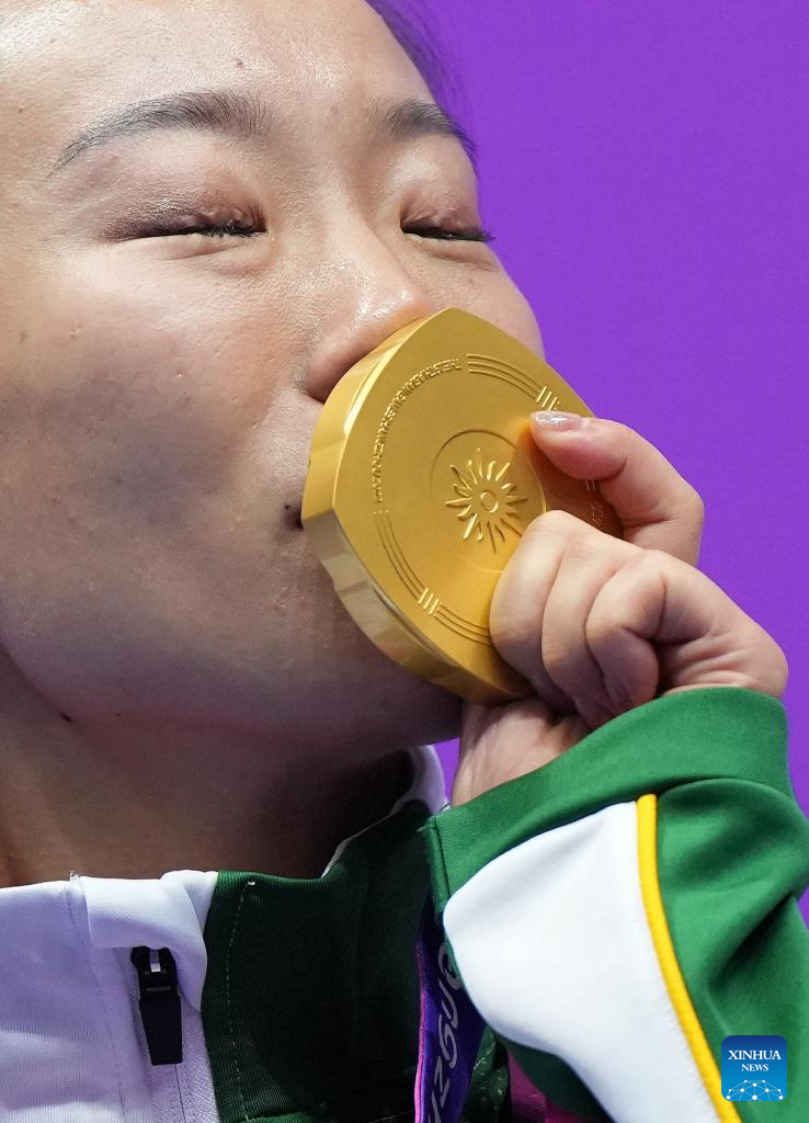 Gold medalist Li Yi of China's Macao kisses her medal during the awarding ceremony for the Women's Changquan of Wushu at the 19th Asian Games in Hangzhou, east China's Zhejiang Province, Sept. 25, 2023. (Xinhua/Li Yibo)