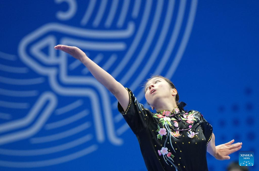 Liu Xuxu of China's Hong Kong competes during the Women's Changquan Final of Wushu at the 19th Asian Games in Hangzhou, east China's Zhejiang Province, Sept. 25, 2023. (Xinhua/Li Yibo)