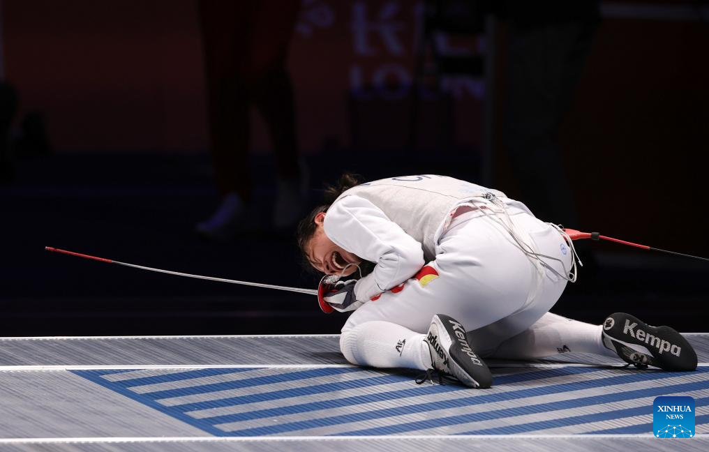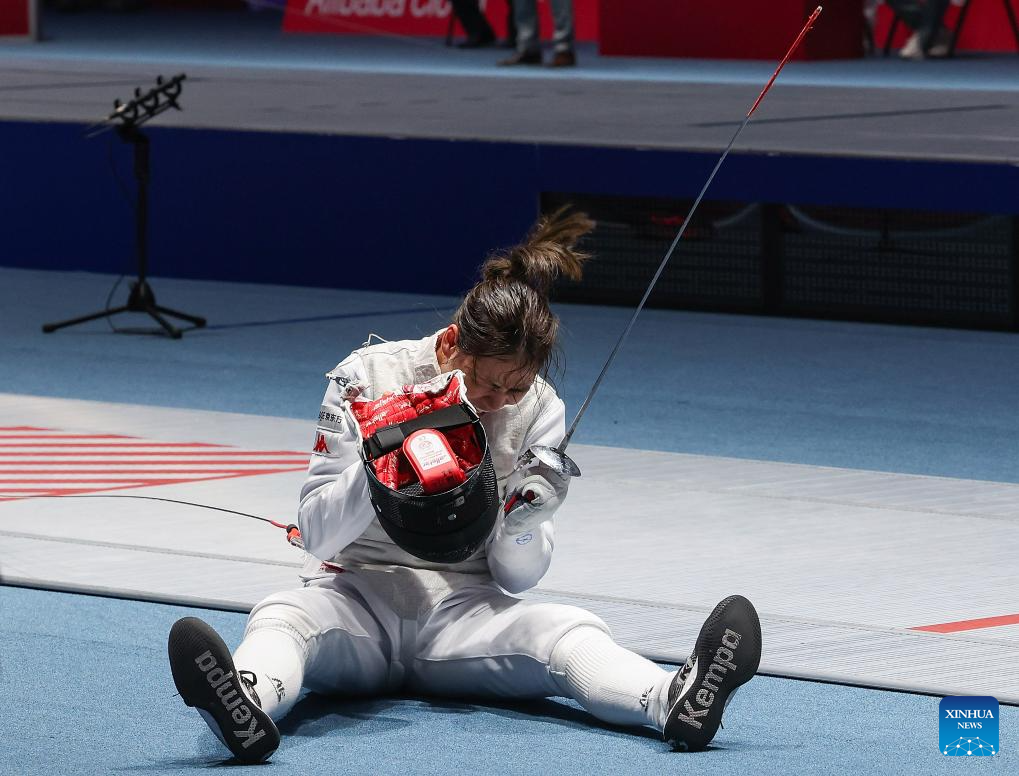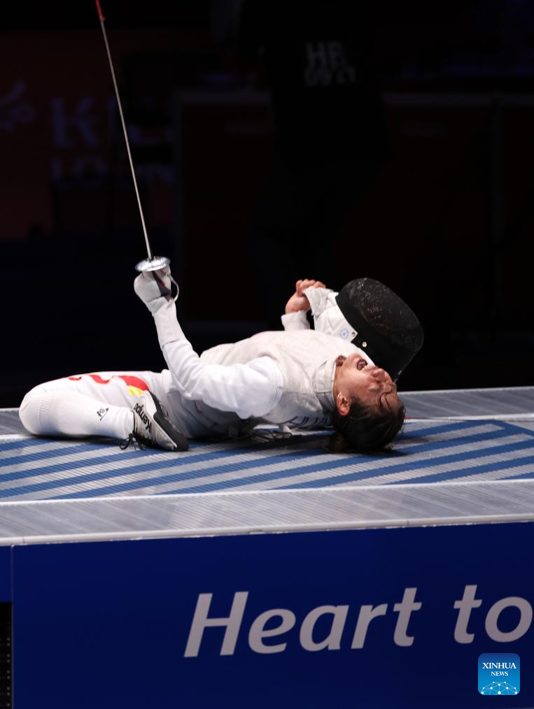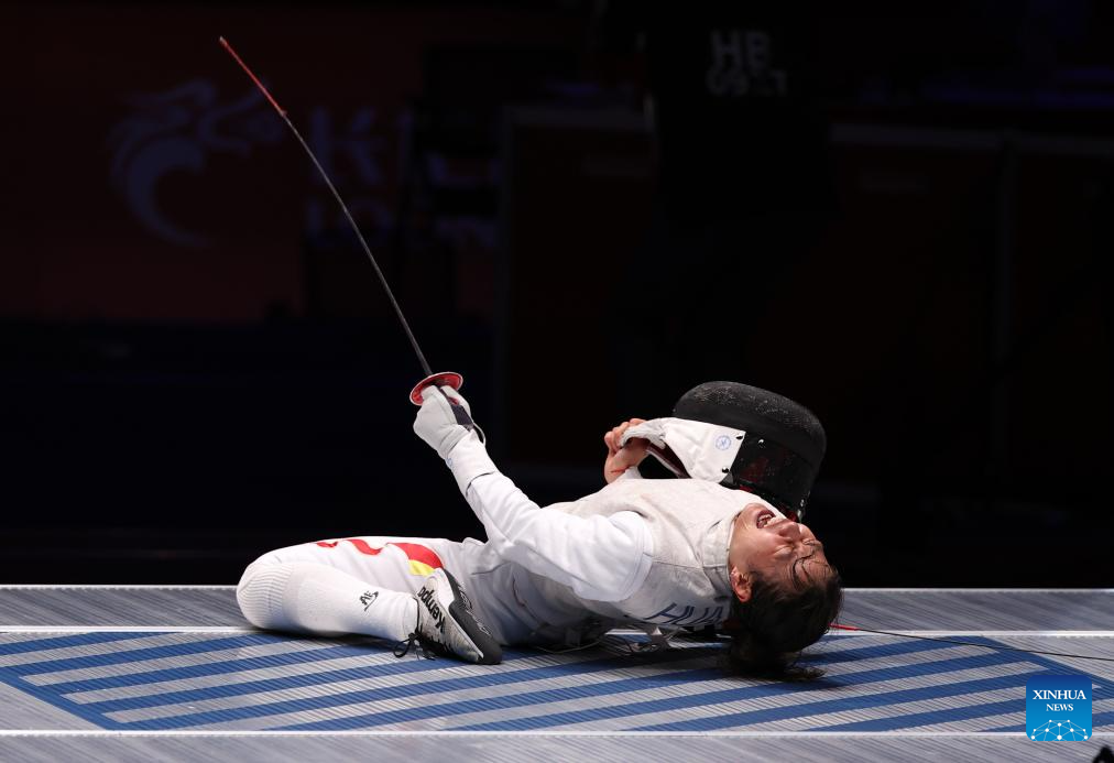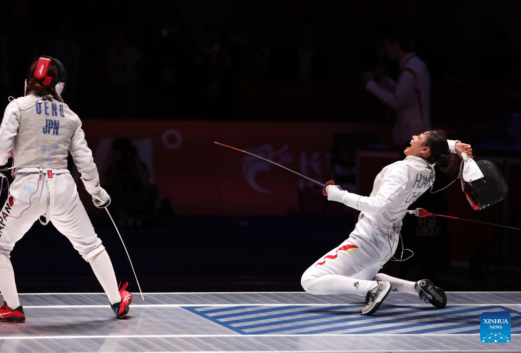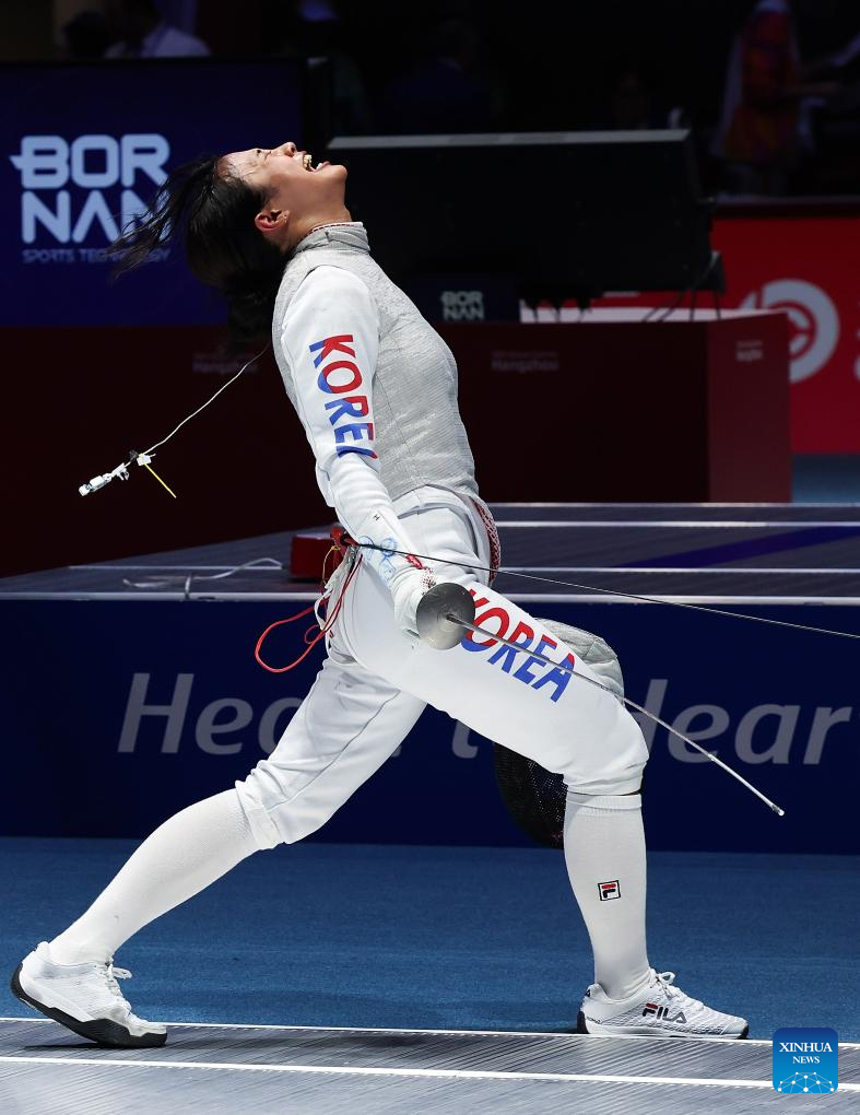 Hong Hyo Jin of South Korea celebrates after the Women's Foil Individual Table of 16 of Fencing between China and South Korea at the 19th Asian Games in Hangzhou, east China's Zhejiang Province, Sept. 25, 2023. (Xinhua/Xu Yu)