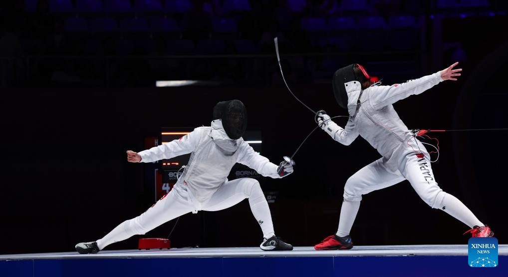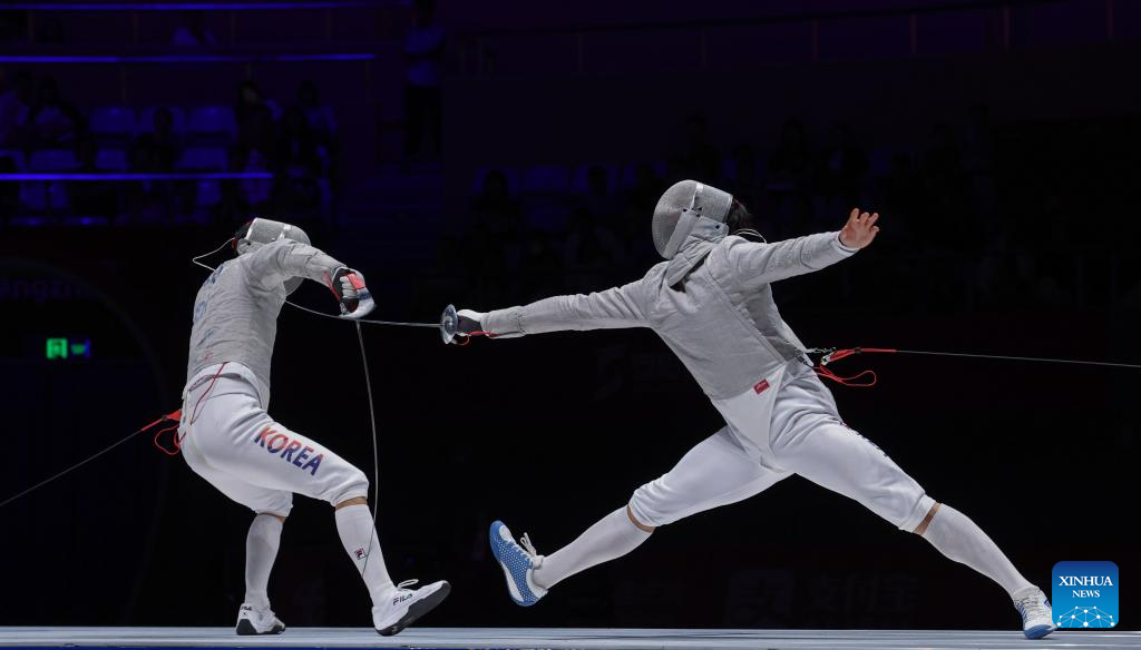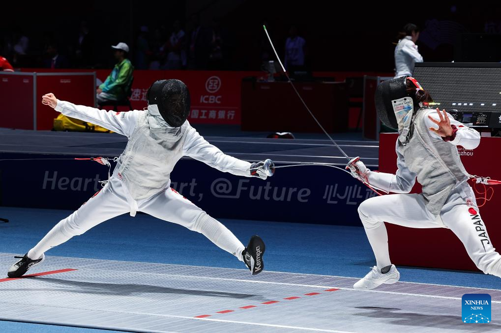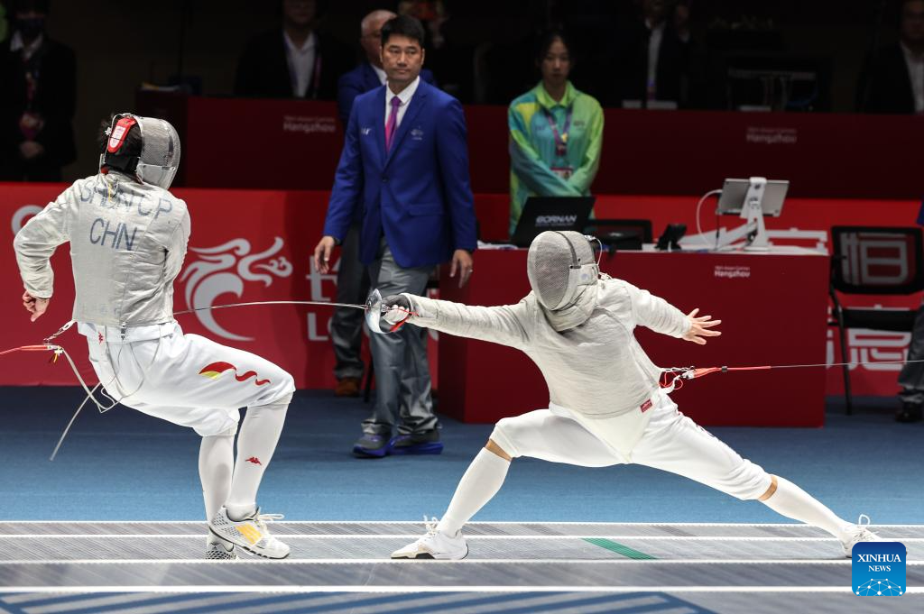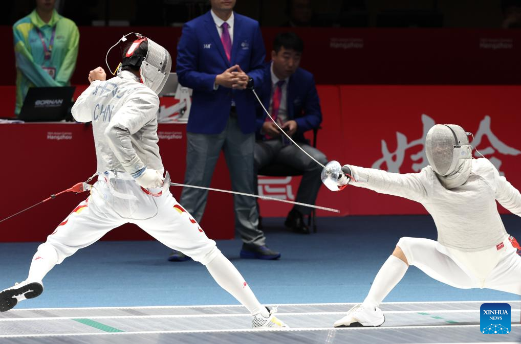Shen Chenpeng (L) of China competes against Gu Bongil of South Korea during the Men's Sabre Individual Quarterfinal of Fencing at the 19th Asian Games in Hangzhou, east China's Zhejiang Province, Sept. 25, 2023. (Xinhua/Yang Lei)
