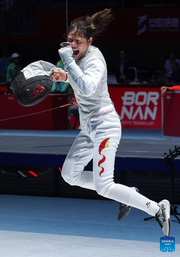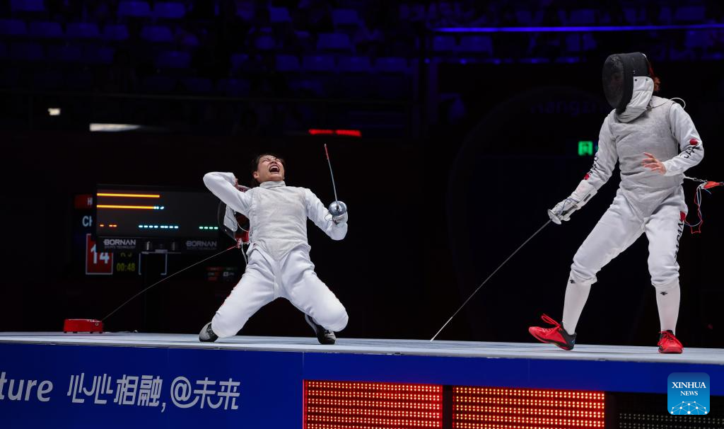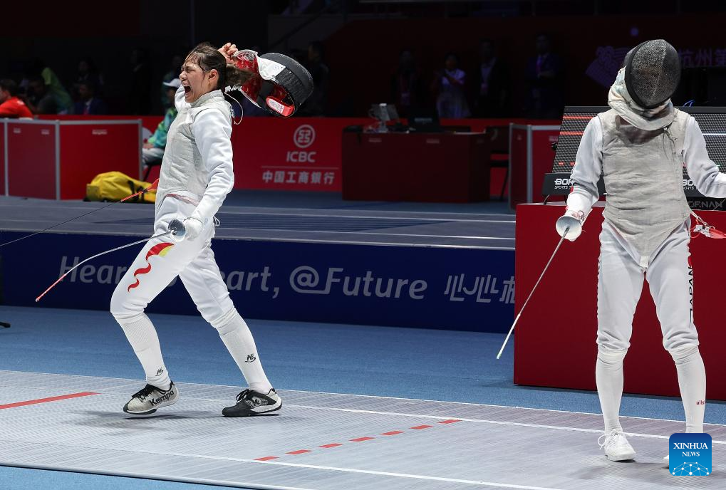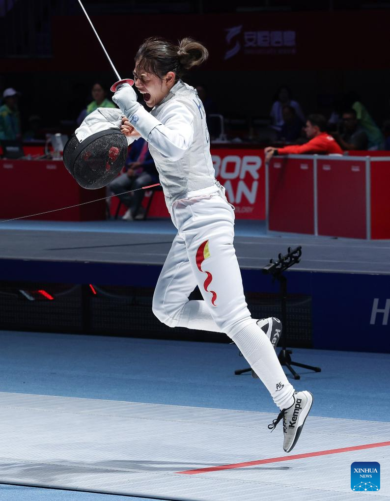 Huang Qianqian of China celebrates winning the Women's Foil Individual Semifinal of Fencing between China and South Korea at the 19th Asian Games in Hangzhou, east China's Zhejiang Province, Sept. 25, 2023. (Xinhua/Xu Yu)