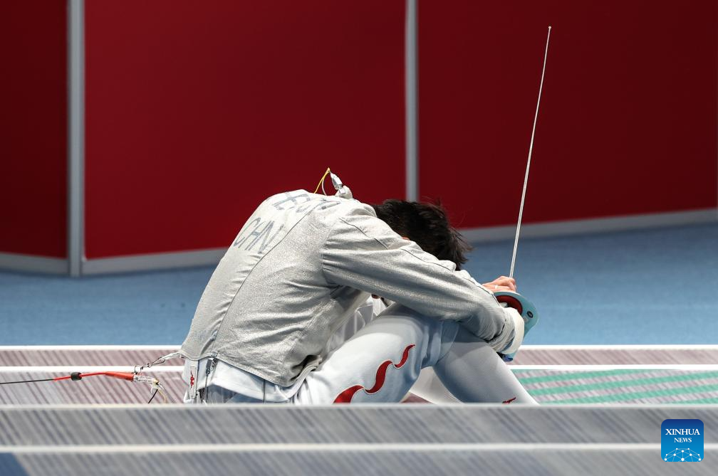 Shen Chenpeng of China reacts during the Men's Sabre Individual Quarterfinal of Fencing against Gu Bongil of South Korea at the 19th Asian Games in Hangzhou, east China's Zhejiang Province, Sept. 25, 2023. (Xinhua/Yang Lei)