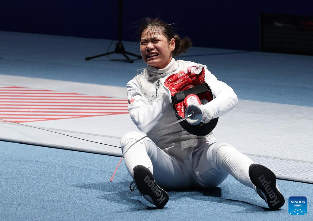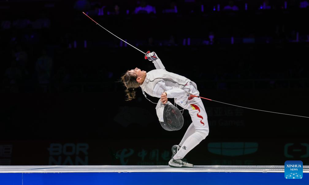 Huang Qianqian of China celebrates after the Women's Foil Individual Quarterfinal of Fencing between China and Japan at the 19th Asian Games in Hangzhou, east China's Zhejiang Province, Sept. 25, 2023. (Xinhua/Xu Yu)