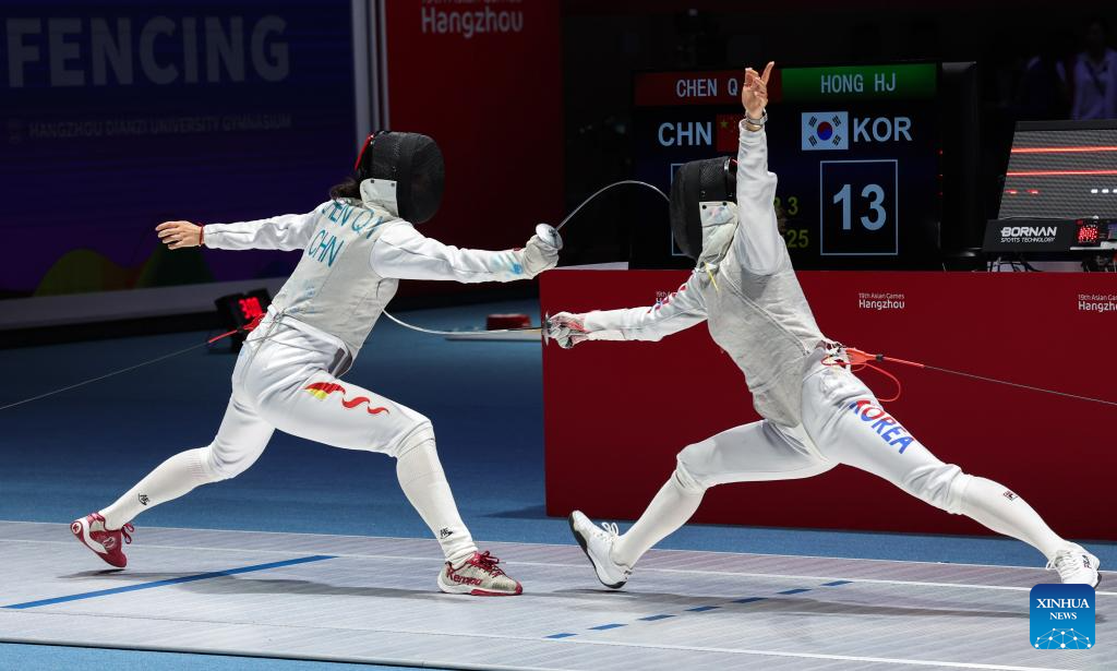 Chen Qingyuan (L) of China competes during the Women's Foil Individual Table of 16 of Fencing between China and South Korea at the 19th Asian Games in Hangzhou, east China's Zhejiang Province, Sept. 25, 2023. (Xinhua/Yang Lei)