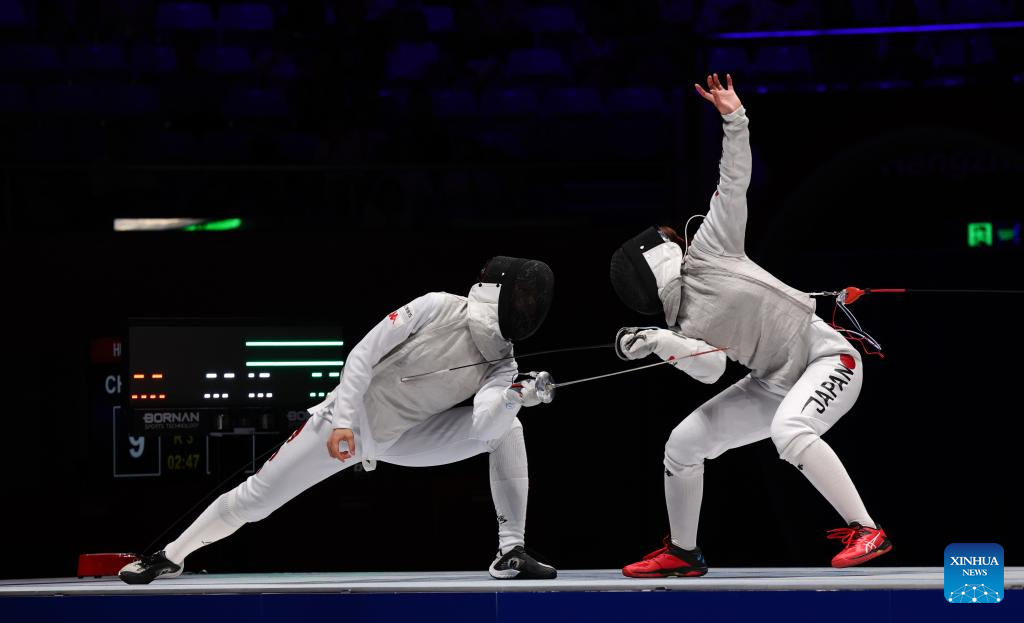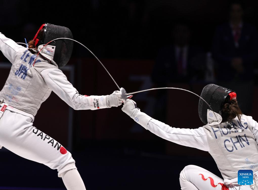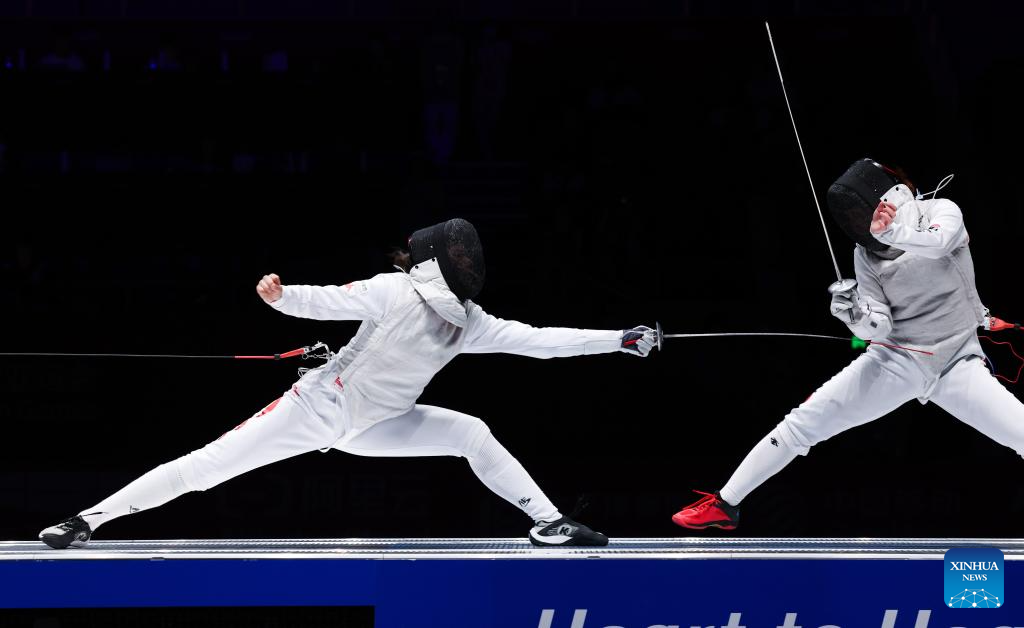 Huang Qianqian (L) of China competes during the Women's Foil Individual Gold Medal Bout of Fencing between China and Japan at the 19th Asian Games in Hangzhou, east China's Zhejiang Province, Sept. 25, 2023. (Xinhua/Xu Yu)
