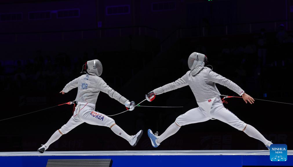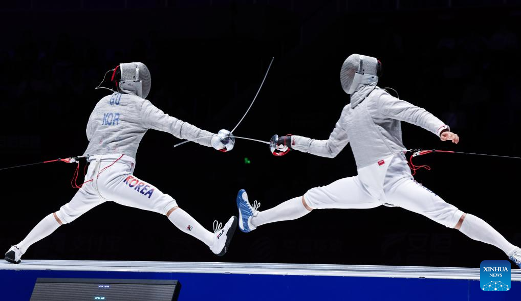 Oh Sanguk (R) of South Korea competes against Gu Bongil of South Korea during the Men's Sabre Individual Gold Medal Bout of Fencing at the 19th Asian Games in Hangzhou, east China's Zhejiang Province, Sept. 25, 2023. (Xinhua/Xu Yu)