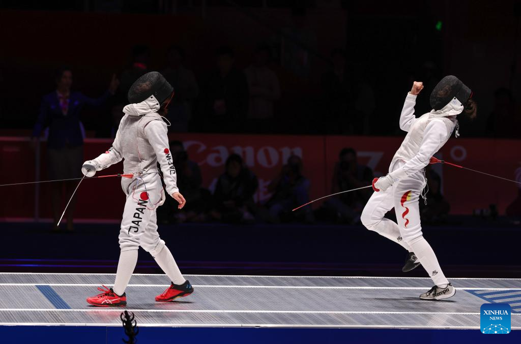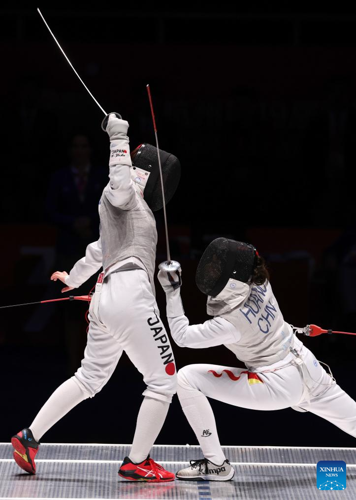 Huang Qianqian (R) of China competes during the Women's Foil Individual Gold Medal Bout of Fencing between China and Japan at the 19th Asian Games in Hangzhou, east China's Zhejiang Province, Sept. 25, 2023. (Xinhua/Yang Lei)