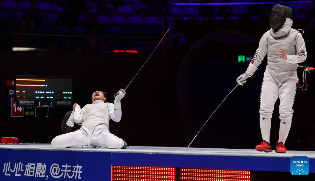 Huang Qianqian (R) of China celebrates after the Women's Foil Individual Gold Medal Bout of Fencing at the 19th Asian Games in Hangzhou, east China's Zhejiang Province, Sept. 25, 2023. (Xinhua/Yang Lei)