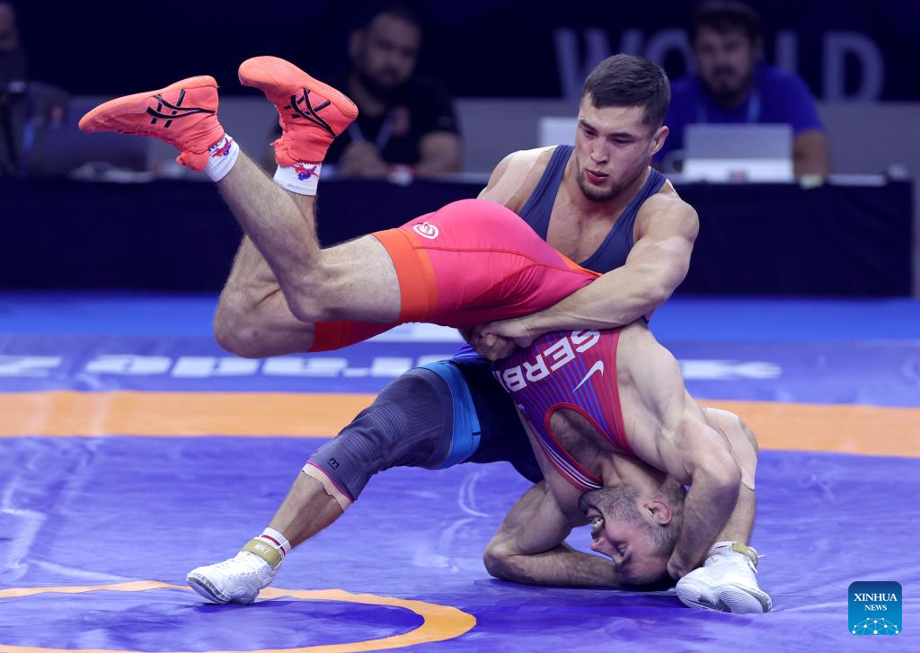 Serbia's Mate Nemes (down) and Kyrgyzstan's Amantur Ismailov compete during their match for bronze medal in the men's 67kg Greco-Roman category at the Wrestling World Championships in Belgrade, Serbia on Sept. 24, 2023. (Photo by Predrag Milosavljevic/Xinhua)