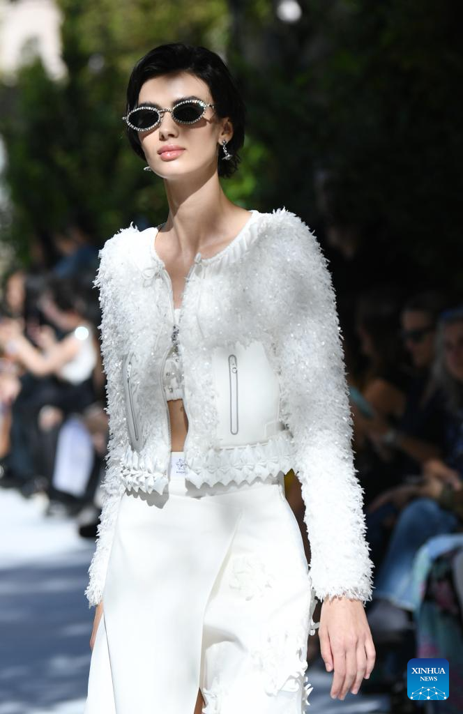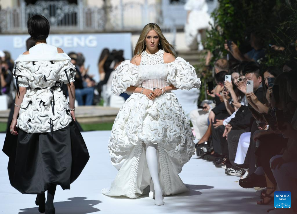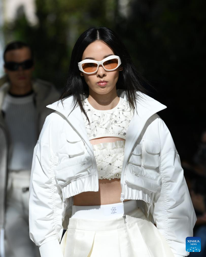A model presents a creation from Bosideng's new collection during a fashion show in Milan, Italy, on Sept. 24, 2023. (Xinhua/Jin Mamengni)
