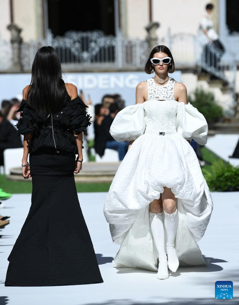 Models present creations from Bosideng's new collection during a fashion show in Milan, Italy, on Sept. 24, 2023. (Xinhua/Jin Mamengni)