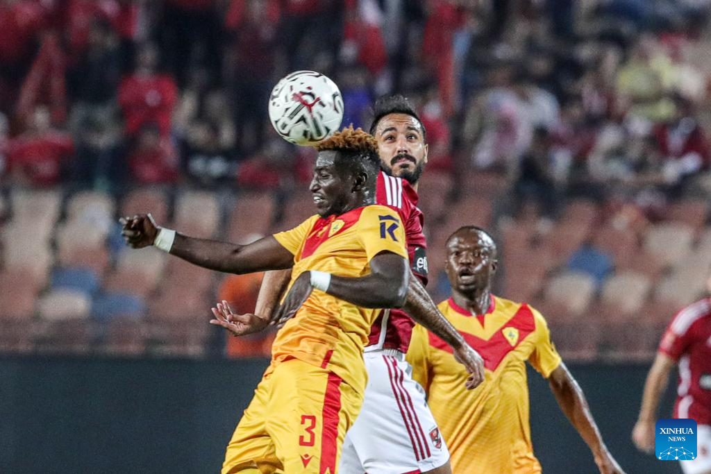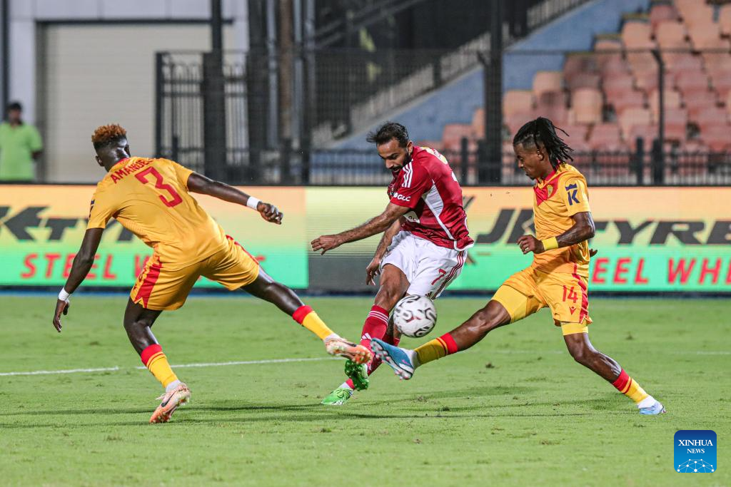 Mahmoud Abdelmonem (C) of Al Ahly shoots during the Confederation of African Football (CAF) Champions League preliminary round match between Al Ahly of Egypt and Saint George of Ethiopia in Cairo, Egypt, Sept. 24, 2023. (Xinhua/Ahmed Gomaa)