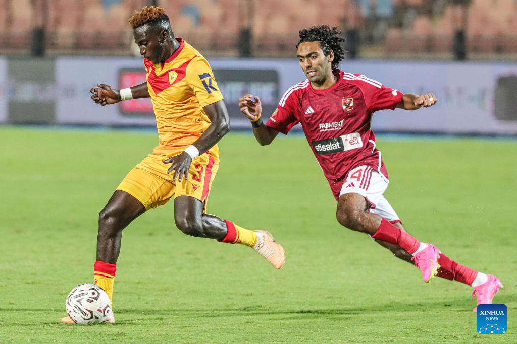 Hussein Aly Elshahat (R) of Al Ahly competes during the Confederation of African Football (CAF) Champions League preliminary round match between Al Ahly of Egypt and Saint George of Ethiopia in Cairo, Egypt, Sept. 24, 2023. (Xinhua/Ahmed Gomaa)