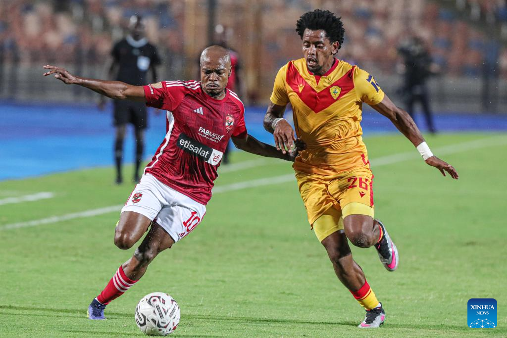 Percy Muzi Tau (L) of Al Ahly competes with Natnael Zeleke of Saint George during the Confederation of African Football (CAF) Champions League preliminary round match between Al Ahly of Egypt and Saint George of Ethiopia in Cairo, Egypt, Sept. 24, 2023. (Xinhua/Ahmed Gomaa)