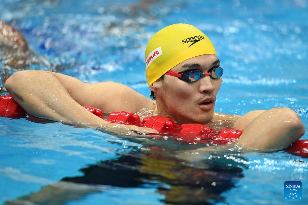 Xu Jiayu of China is seen after the Men's 50m Backstroke Heat of Swimming at the 19th Asian Games in Hangzhou, east China's Zhejiang Province, Sept. 25, 2023. (Xinhua/Huang Zongzhi)