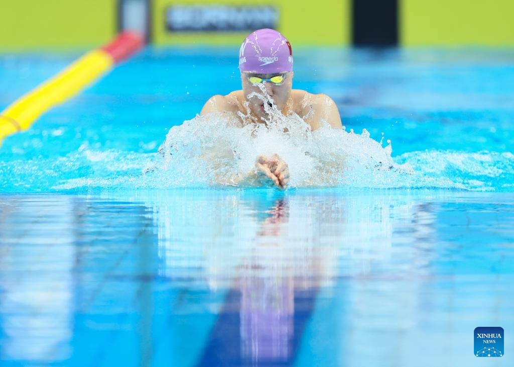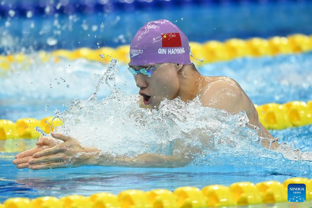 Qin Haiyang of China competes during the Men's 100m Breaststroke Heat of Swimming at the 19th Asian Games in Hangzhou, east China's Zhejiang Province, Sept. 25, 2023. (Xinhua/Lan Hongguang)