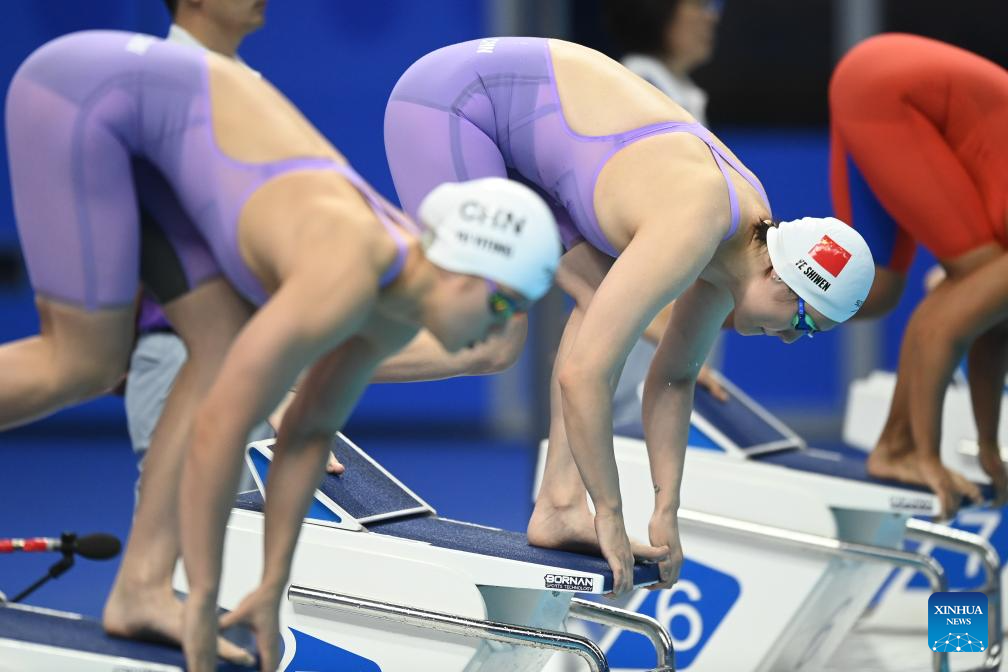 Wang Xueer (C) of China competes during the Women's 50m Backstroke Heat of Swimming at the 19th Asian Games in Hangzhou, east China's Zhejiang Province, Sept. 25, 2023. (Xinhua/Lan Hongguang)