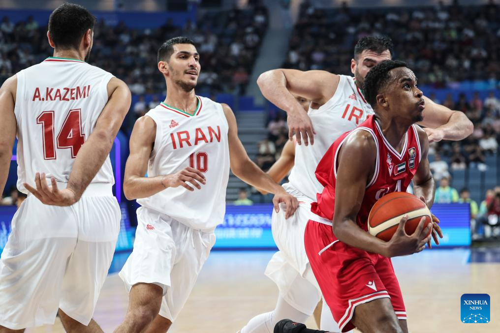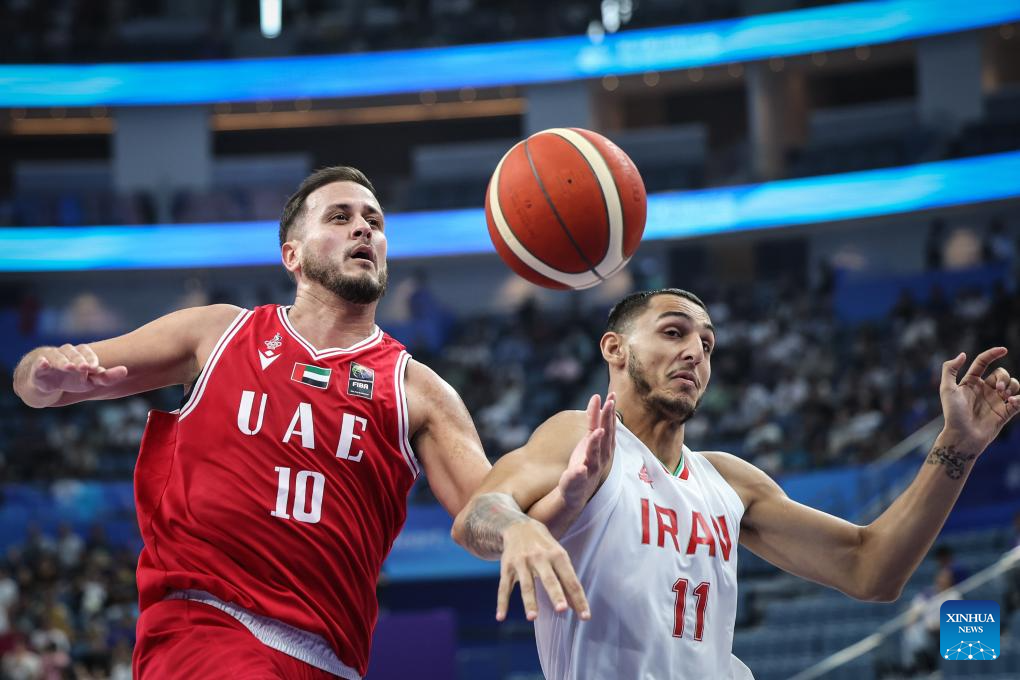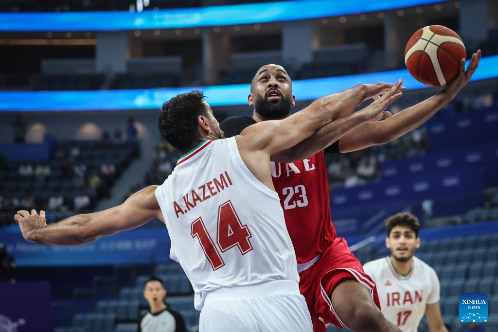 Hamid Albreiki (R) of the United Arab Emirates competes during the Men's Preliminary Round match of Basketball between Iran and the United Arab Emirates at the 19th Asian Games in Hangzhou, east China's Zhejiang Province, Sept. 26, 2023. (Xinhua/Pan Yulong)