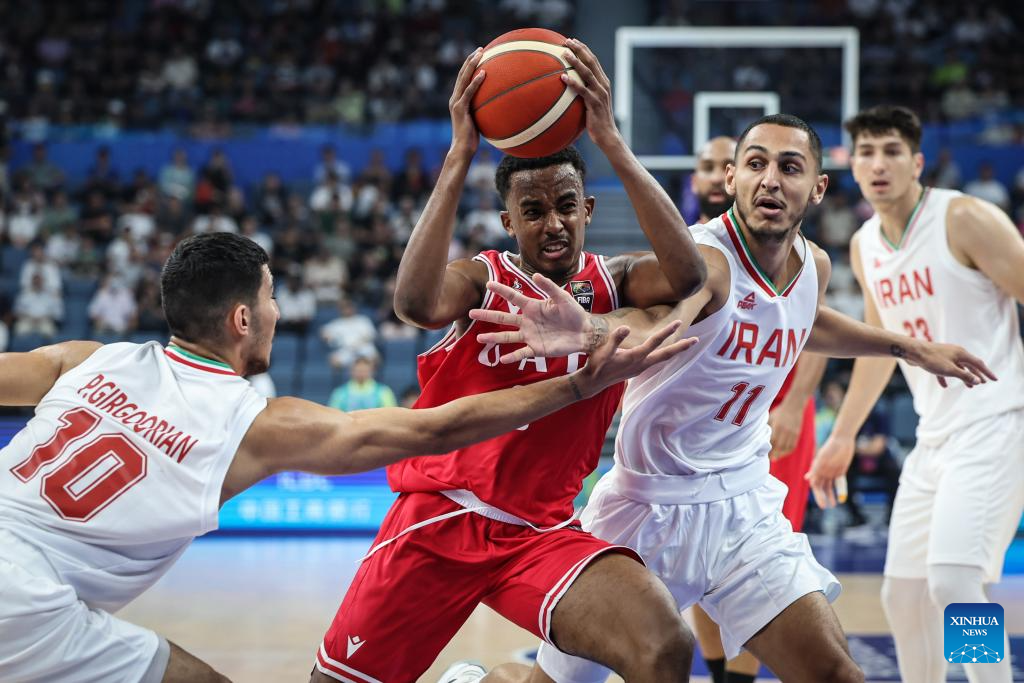 Hamid Albreiki (R) of the United Arab Emirates competes against Mohammadsina Vahedi of Iran during the Men's Preliminary Round match of Basketball between Iran and the United Arab Emirates at the 19th Asian Games in Hangzhou, east China's Zhejiang Province, Sept. 26, 2023. (Xinhua/Pan Yulong)