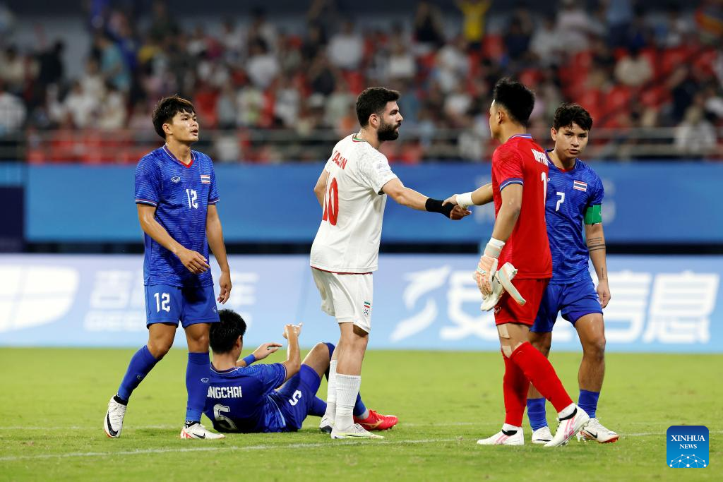 Yasin Salmani (C) of Iran shakes hands with Lakhonphon Nopphon of Thailand after the Men's Round of 16 between Iran and Thailand at the 19th Asian Games in Hangzhou, east China's Zhejiang Province, Sept. 27, 2023. (Xinhua/Wang Peng)