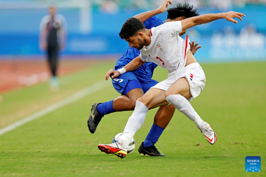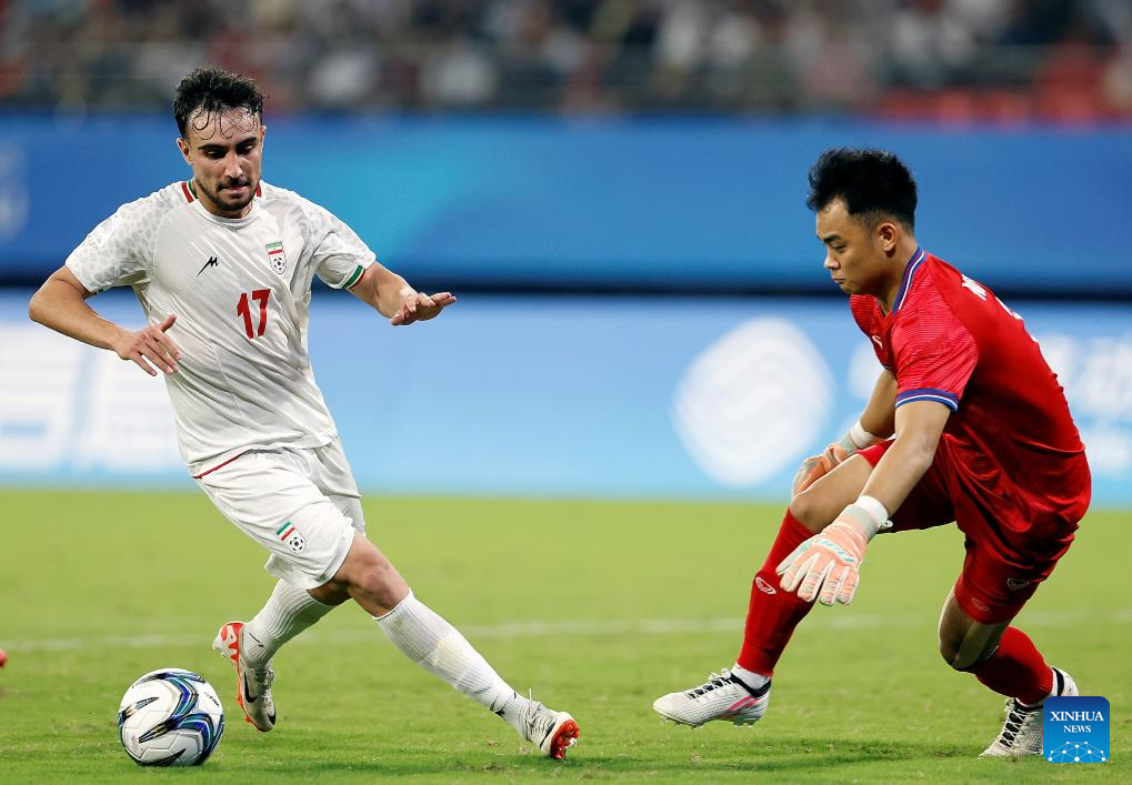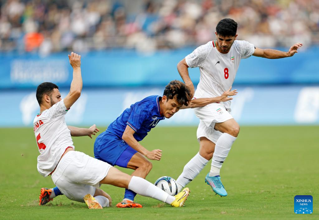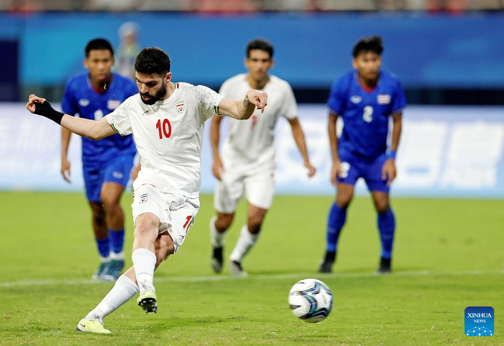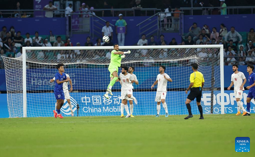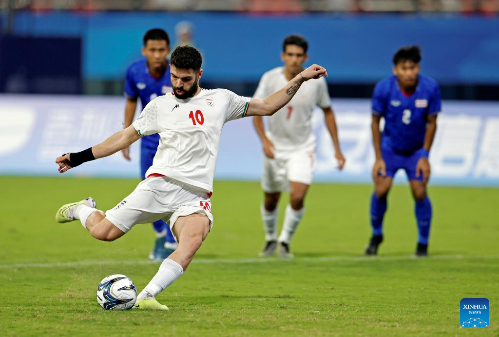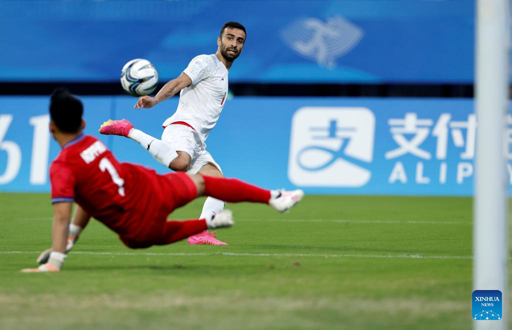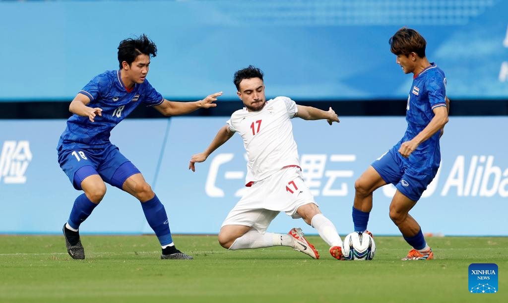 Mahdi Mamizadeh (C) of Iran competes during the Men's Round of 16 between Iran and Thailand at the 19th Asian Games in Hangzhou, east China's Zhejiang Province, Sept. 27, 2023. (Xinhua/Wang Peng)