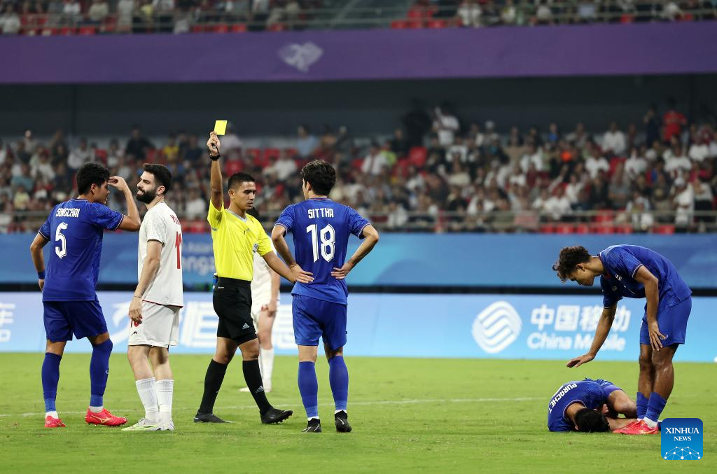 Yasin Salmani (2nd, L) of Iran is shown a yellow card by referee during the Men's Round of 16 between Iran and Thailand at the 19th Asian Games in Hangzhou, east China's Zhejiang Province, Sept. 27, 2023. (Xinhua/Wang Peng)