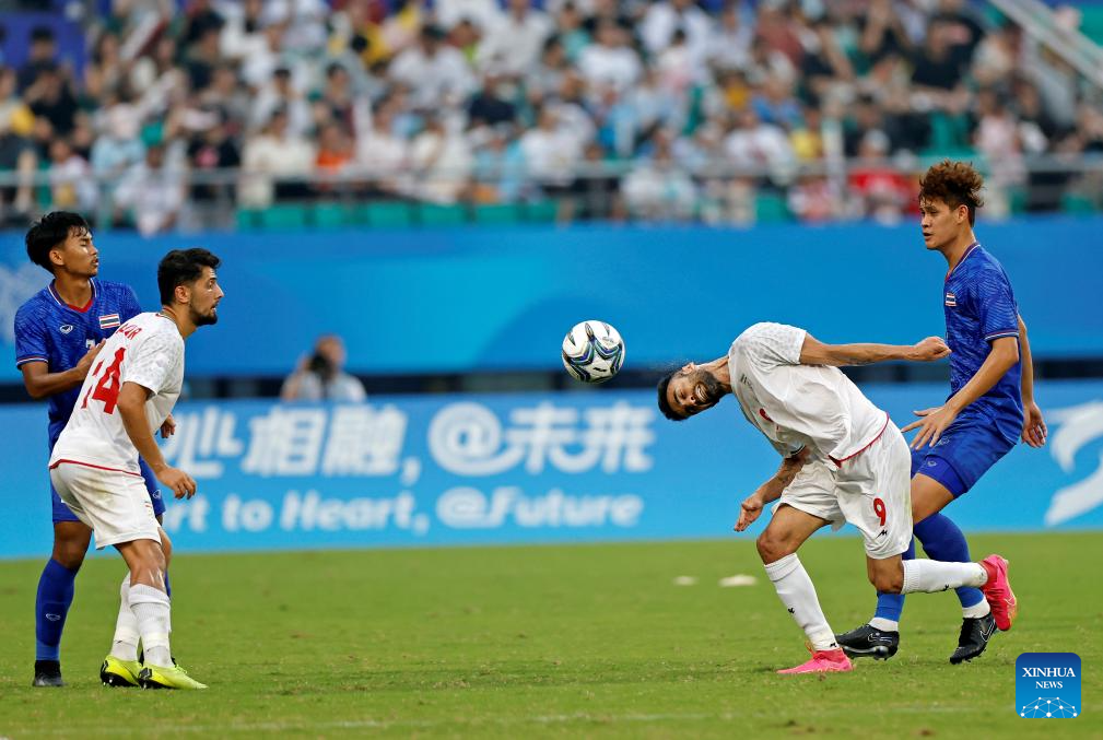 Mohammad Omri (2nd, R) of Iran competes during the Men's Round of 16 between Iran and Thailand at the 19th Asian Games in Hangzhou, east China's Zhejiang Province, Sept. 27, 2023. (Xinhua/Wang Peng)