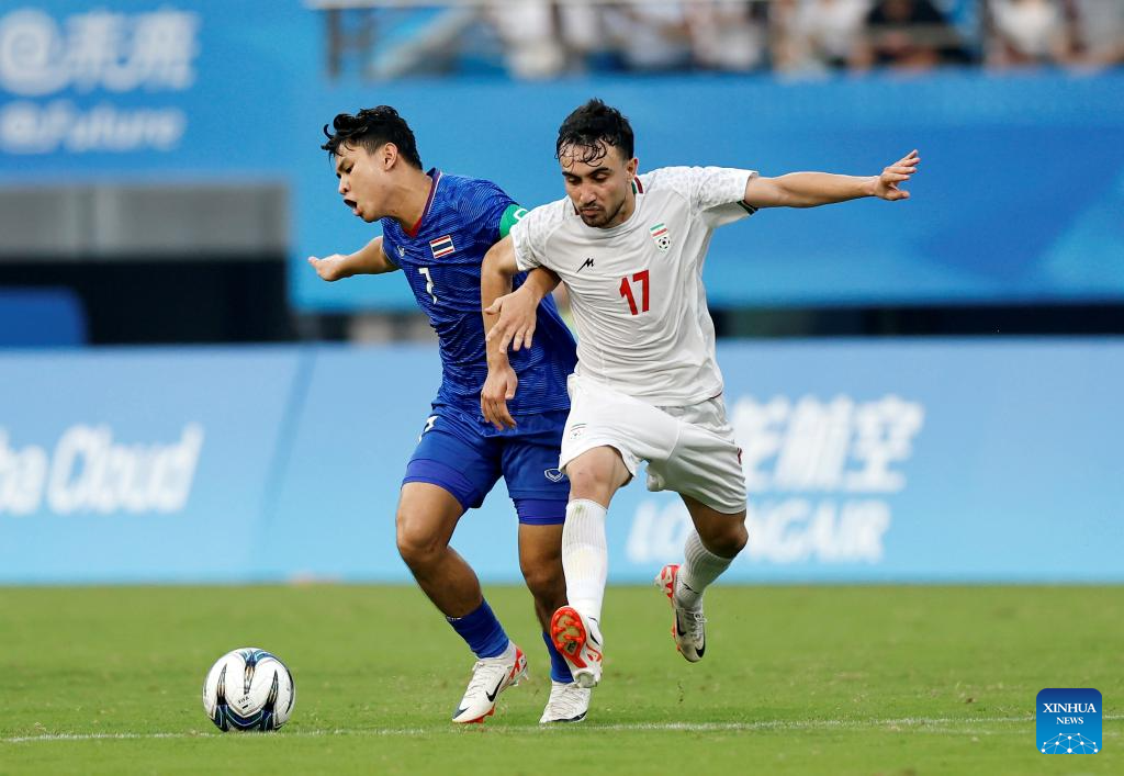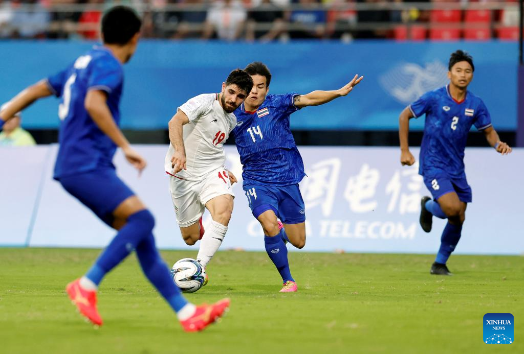 Mohammad Omri (2nd, R) of Iran passes the ball during the Men's Round of 16 between Iran and Thailand at the 19th Asian Games in Hangzhou, east China's Zhejiang Province, Sept. 27, 2023. (Xinhua/Wang Peng)