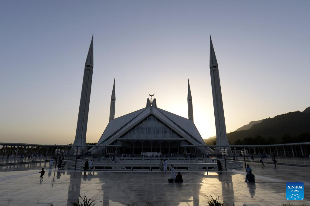 Tourists visit the Faisal Mosque in Islamabad, capital of Pakistan, on Sept. 26, 2023. (Xinhua/Ahmad Kamal)