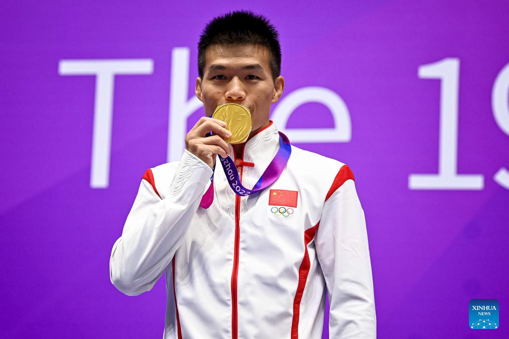 Wang Xuetao of China poses during the awarding ceremony for the Men's 60kg of Wushu at the 19th Asian Games in Hangzhou, east China's Zhejiang Province, Sept. 28, 2023. (Xinhua/Jiang Han)
