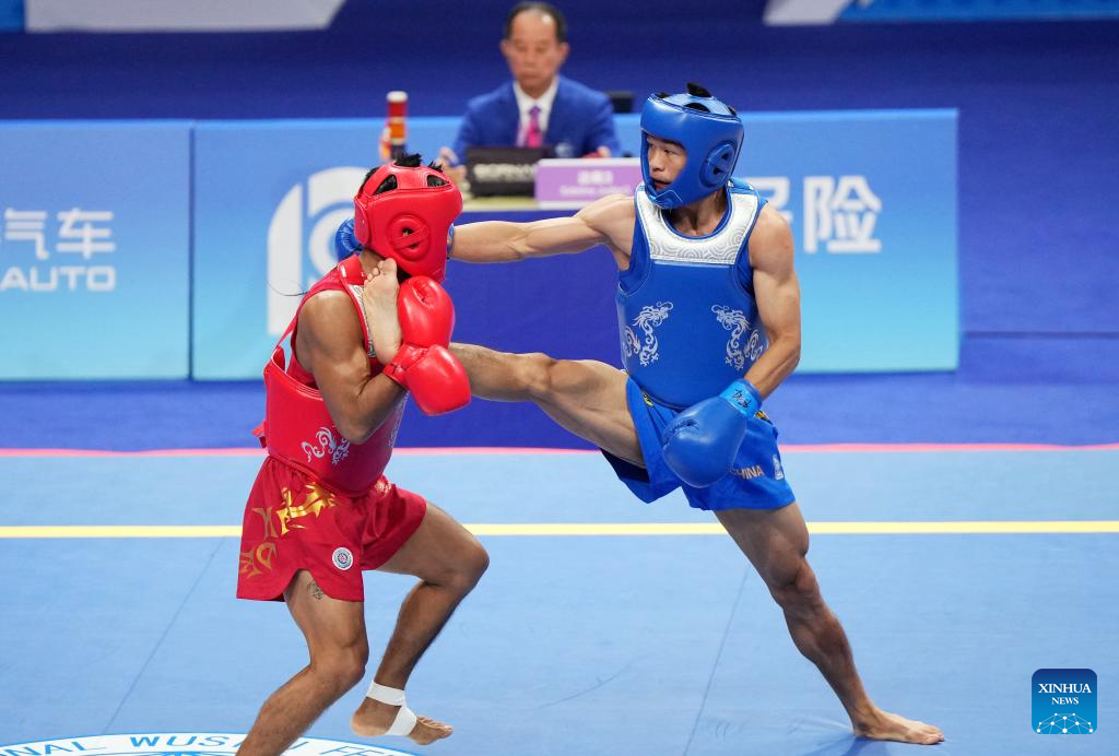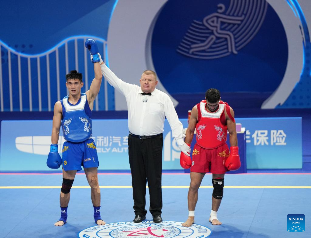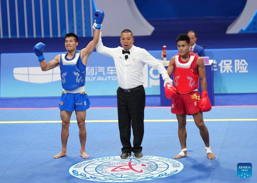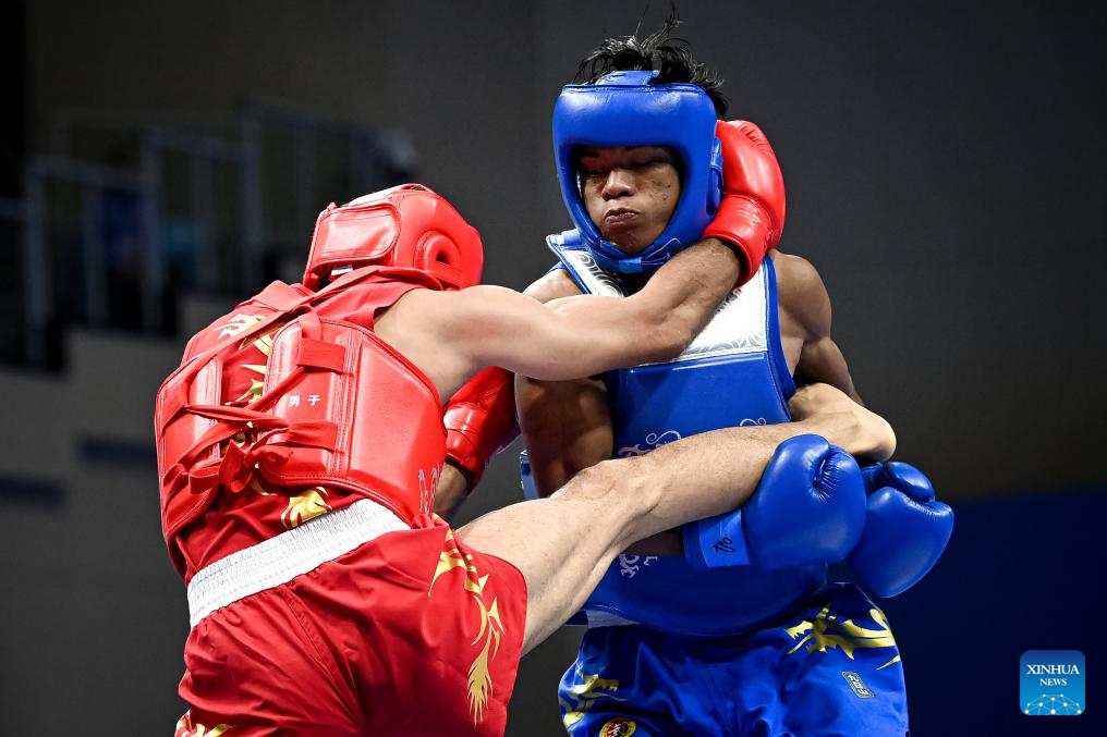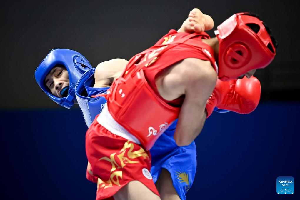 He Feng (L) of China wins the Men's 70kg Final of Wushu at the 19th Asian Games in Hangzhou, east China's Zhejiang Province, Sept. 28, 2023. (Xinhua/Li Yibo)