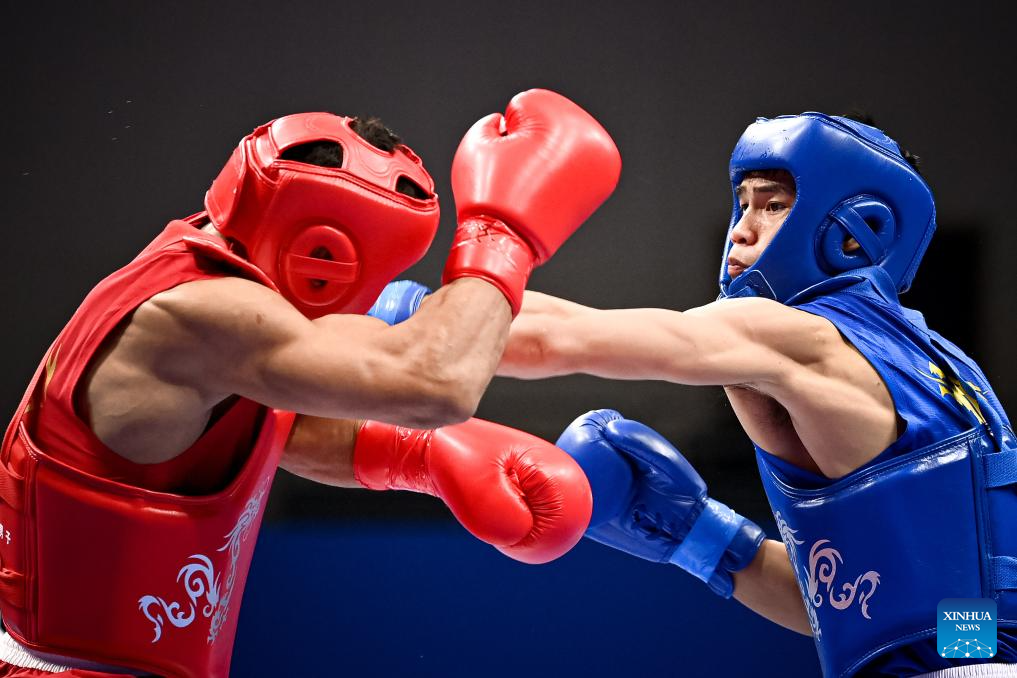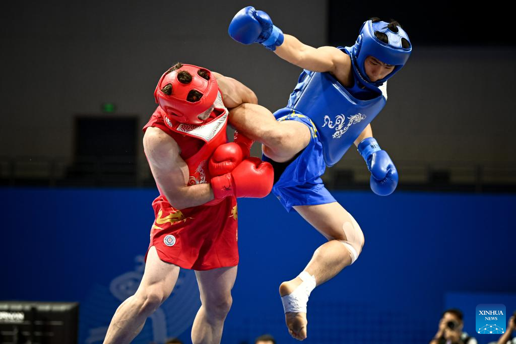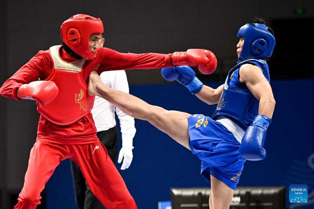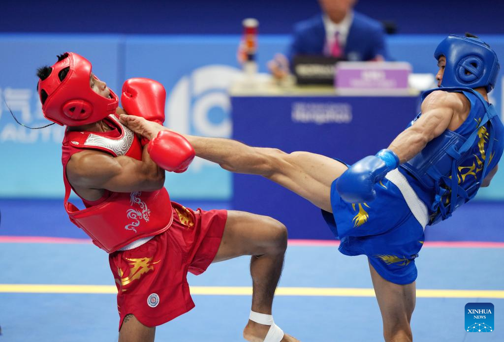 He Feng (R) of China competes against Mohsen Mohammadseifi of Iran during the Men's 70kg Final of Wushu at the 19th Asian Games in Hangzhou, east China's Zhejiang Province, Sept. 28, 2023. (Xinhua/Jiang Han)