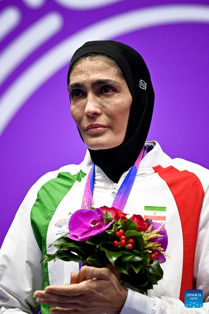 Elaheh Mansoryan Samiroumi of Iran attends the awarding ceremony for the Women's 52kg of Wushu at the 19th Asian Games in Hangzhou, east China's Zhejiang Province, Sept. 28, 2023. (Xinhua/Jiang Han)