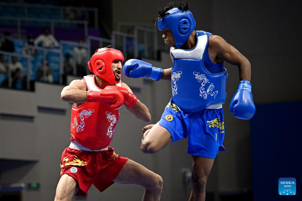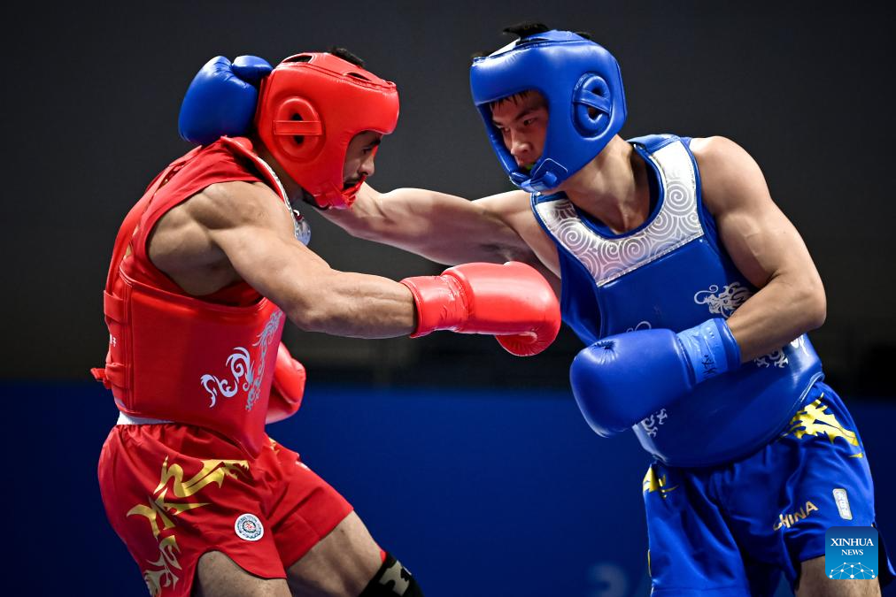 Afshin Salimi Toupghara (L) of Iran competes with Samuel Marbun of Indonesia during the Men's 65kg Final of Wushu at the 19th Asian Games in Hangzhou, east China's Zhejiang Province, Sept. 28, 2023. (Xinhua/Jiang Han)