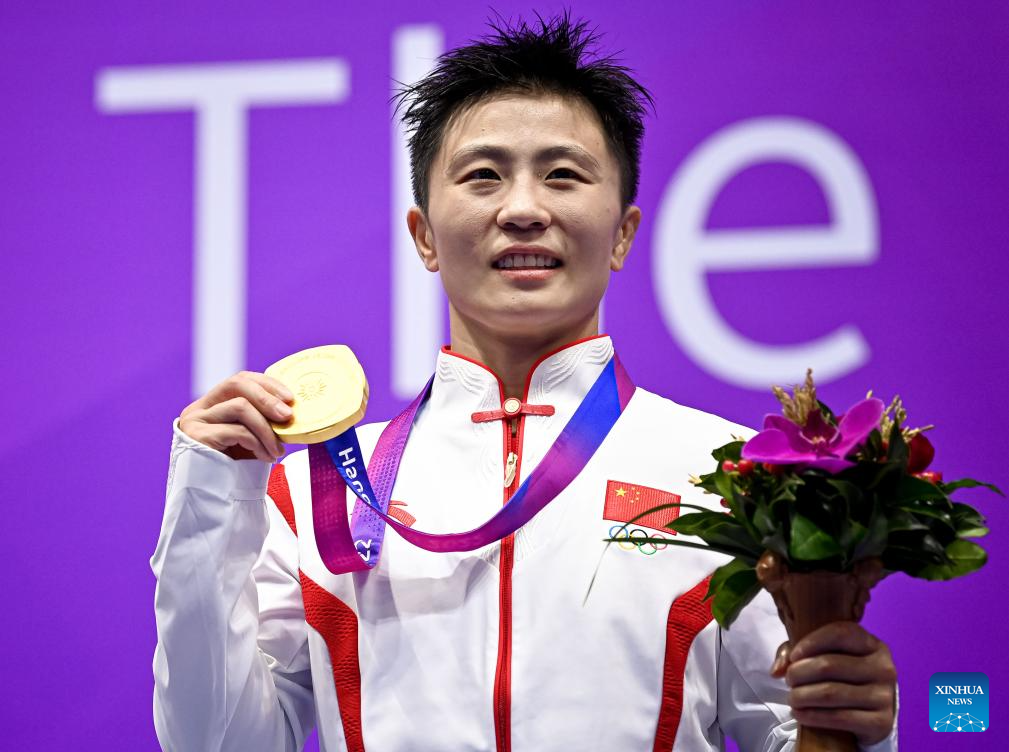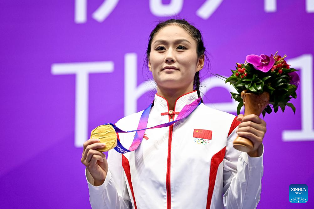 Gold medalist Wu Xiaowei of China poses during the awarding ceremony for the Women's 60kg Final of Wushu at the 19th Asian Games in Hangzhou, east China's Zhejiang Province, Sept. 28, 2023. (Xinhua/Jiang Han)