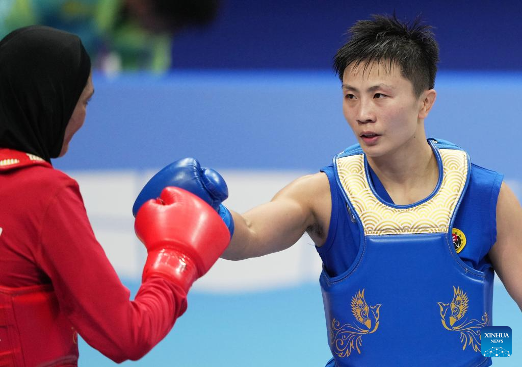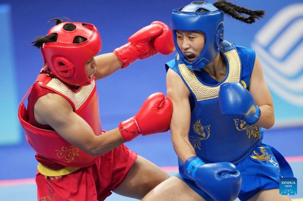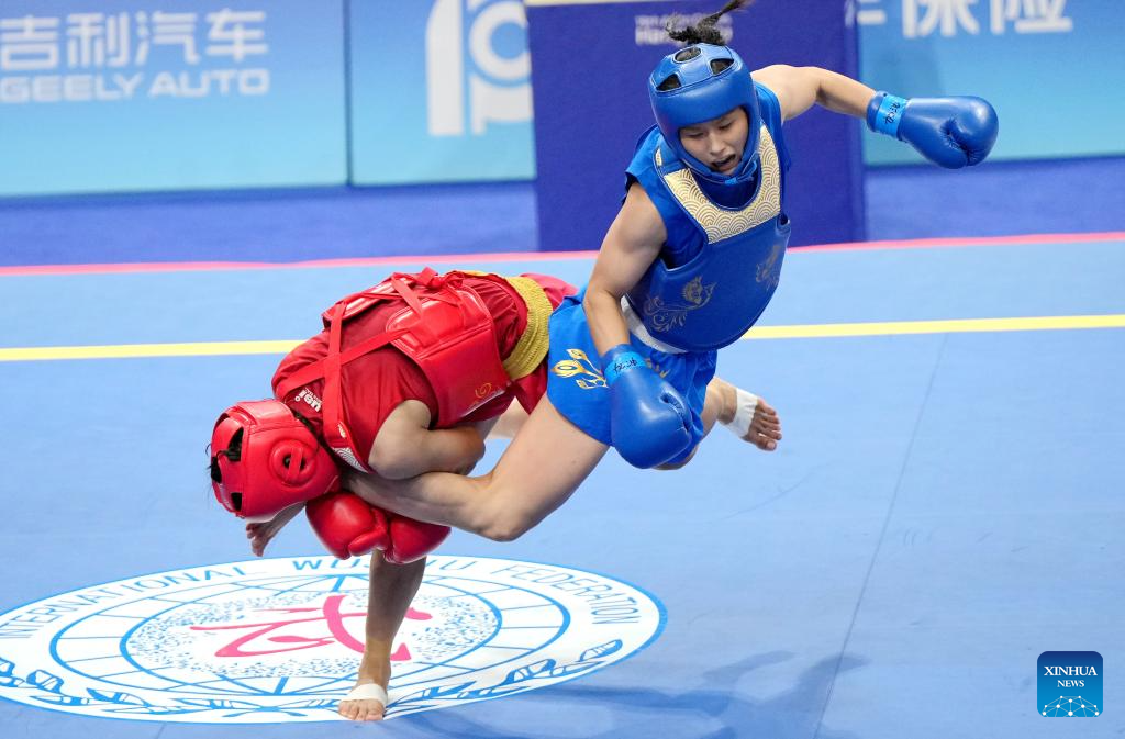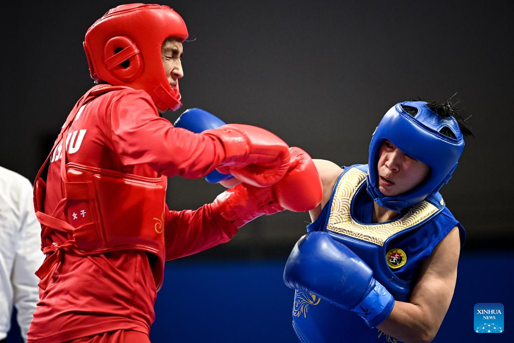 Wu Xiaowei (R) of China competes against Roshibina Devi Naorem of India during the Women's 60kg Final of Wushu at the 19th Asian Games in Hangzhou, east China's Zhejiang Province, Sept. 28, 2023. (Xinhua/Li Yibo)