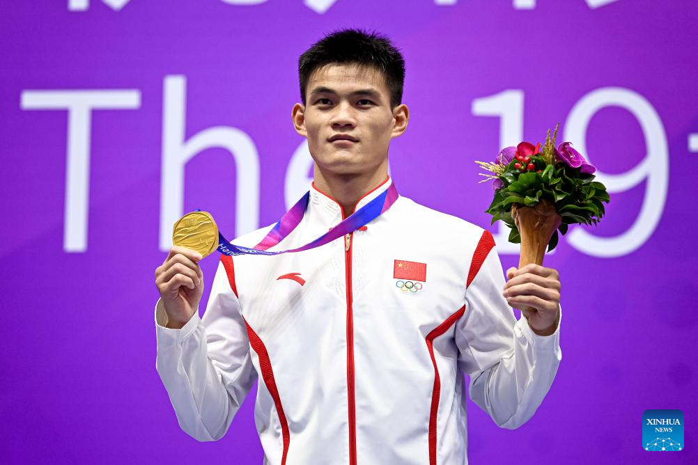 Wang Xuetao of China poses during the awarding ceremony for the Men's 60kg of Wushu at the 19th Asian Games in Hangzhou, east China's Zhejiang Province, Sept. 28, 2023. (Xinhua/Li Yibo)